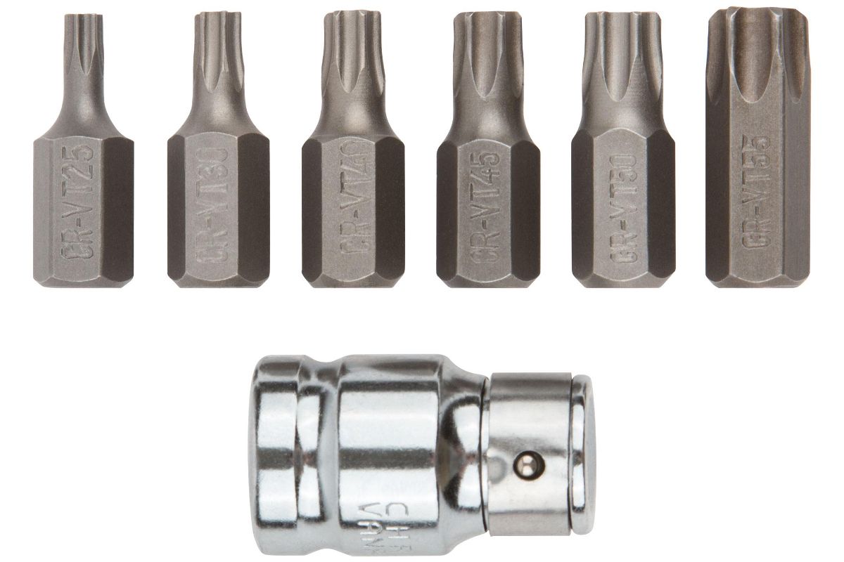 В наборе: 6 бит из хром-ванадиевой стали (T25; T30; T40; T45; T50; T55) + адаптер с воротка на биту с посадочным диаметром 1/2''. Упаковка: коробка с подвесом.