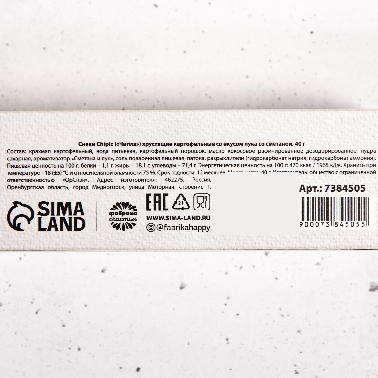 Состав: крахмал картофельный, вода питьевая, картофельный порошок, масло кокосовое рафинированное дезодорированное, пудра сахарная, ароматизатор «Сметана и лук», соль поваренная пищевая, патока, разрыхлители (гидрокарбонат натрия, гидрокарбонат аммония).