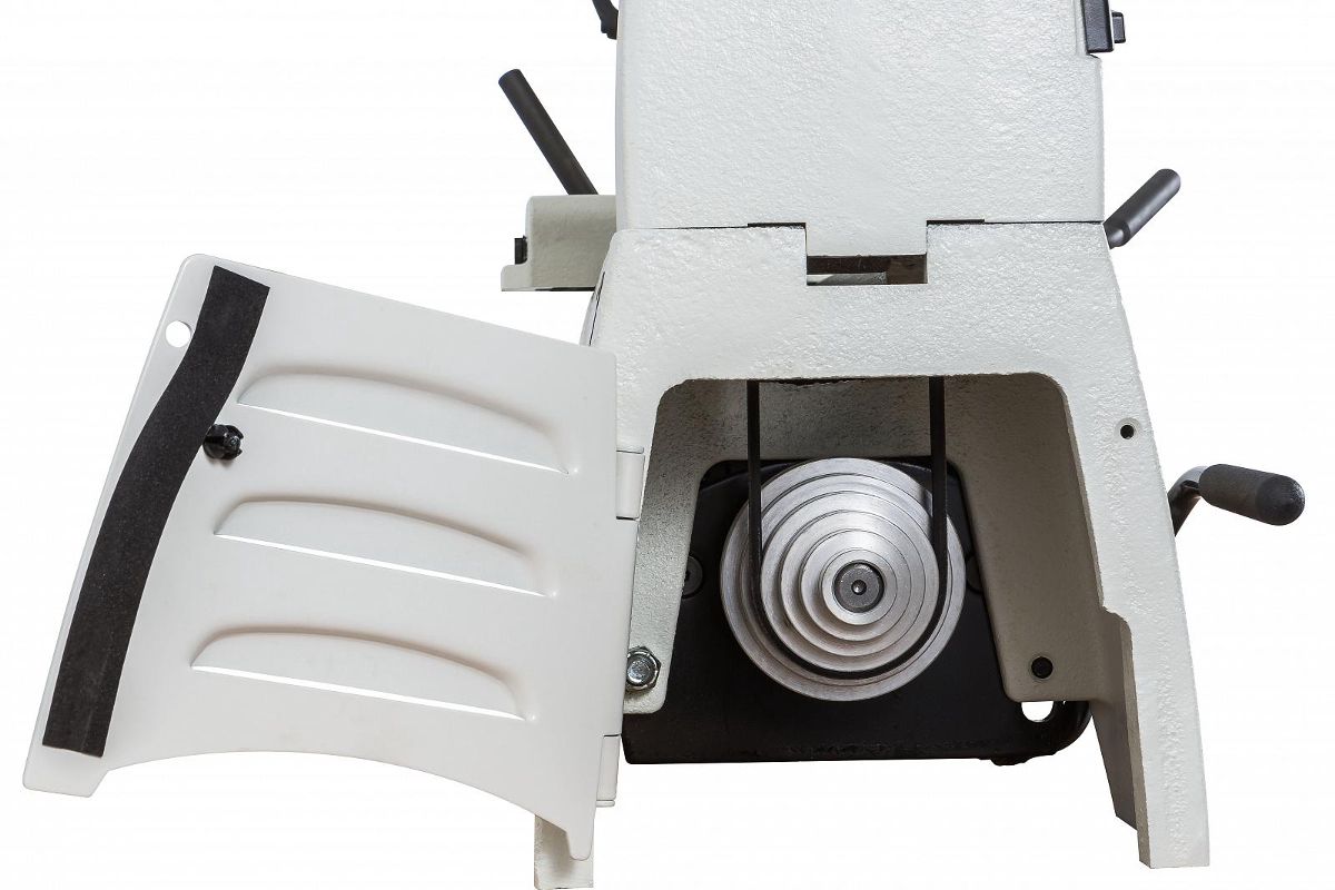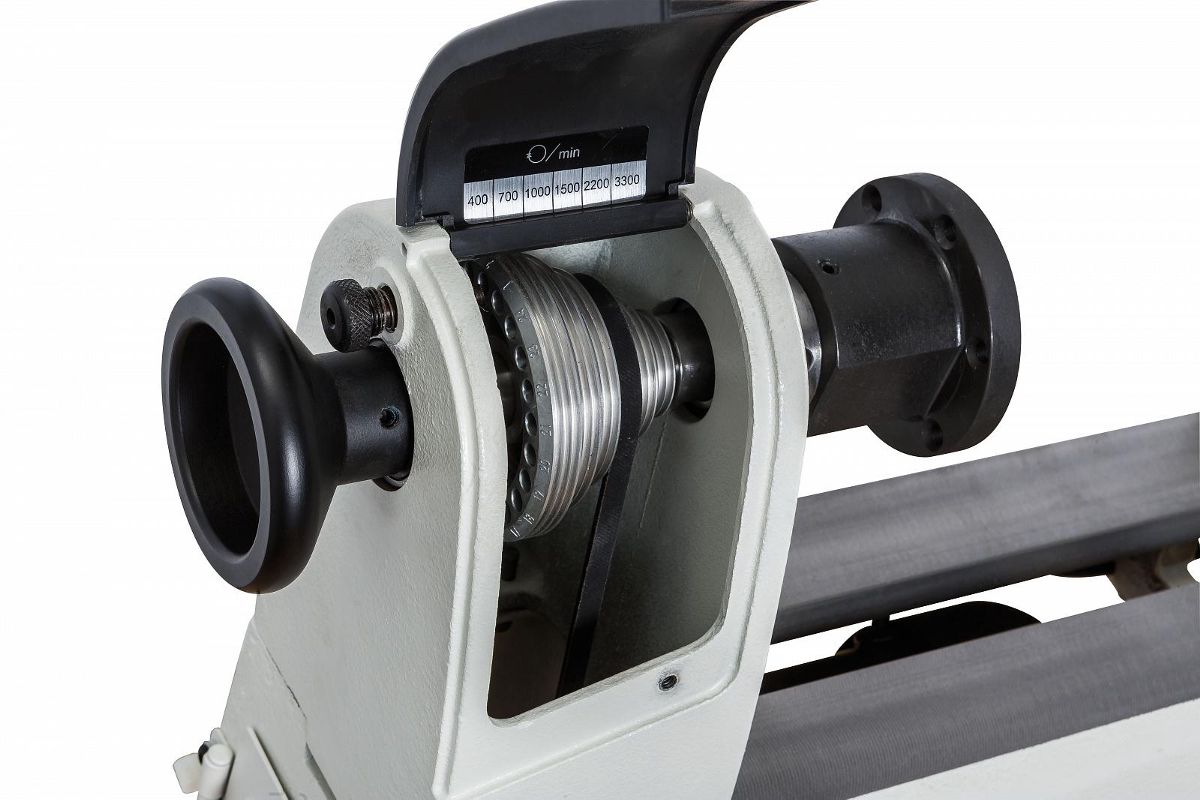 Станок оборудован асинхронным мотором, который работает с постоянной частотой вращения (1400 об/мин). Для выбора скорости шпинделя меняют положение поликлинового ремня (предусмотрено шесть пар шкивов). Эта операция занимает минимум времени и производится без использования вспомогательных инструментов.