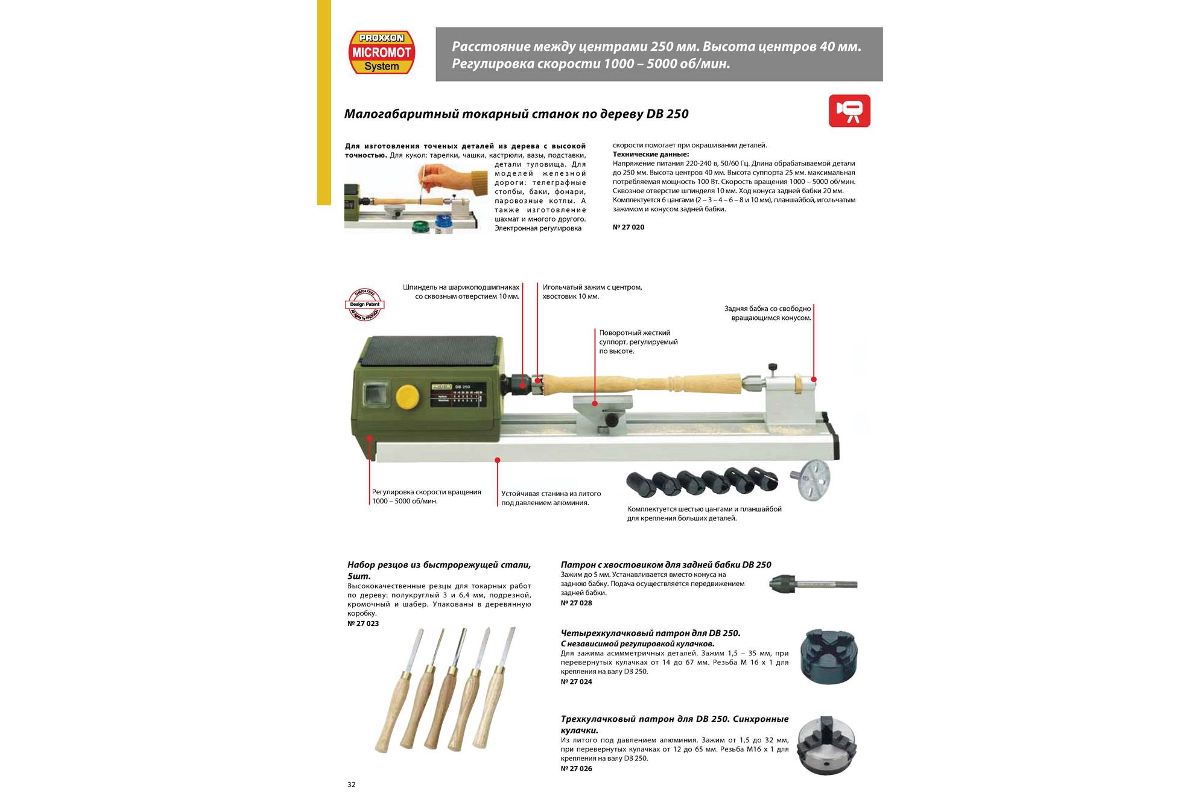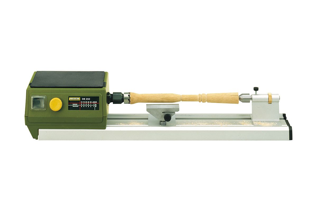 PROXXON DB 250 — малогабаритный токарный станок для обработки небольших заготовок из дерева. Популярен среди моделистов-любителей. Длина обрабатываемой детали — до 250 мм. Скорость регулируется — 500-5000 об/мин.