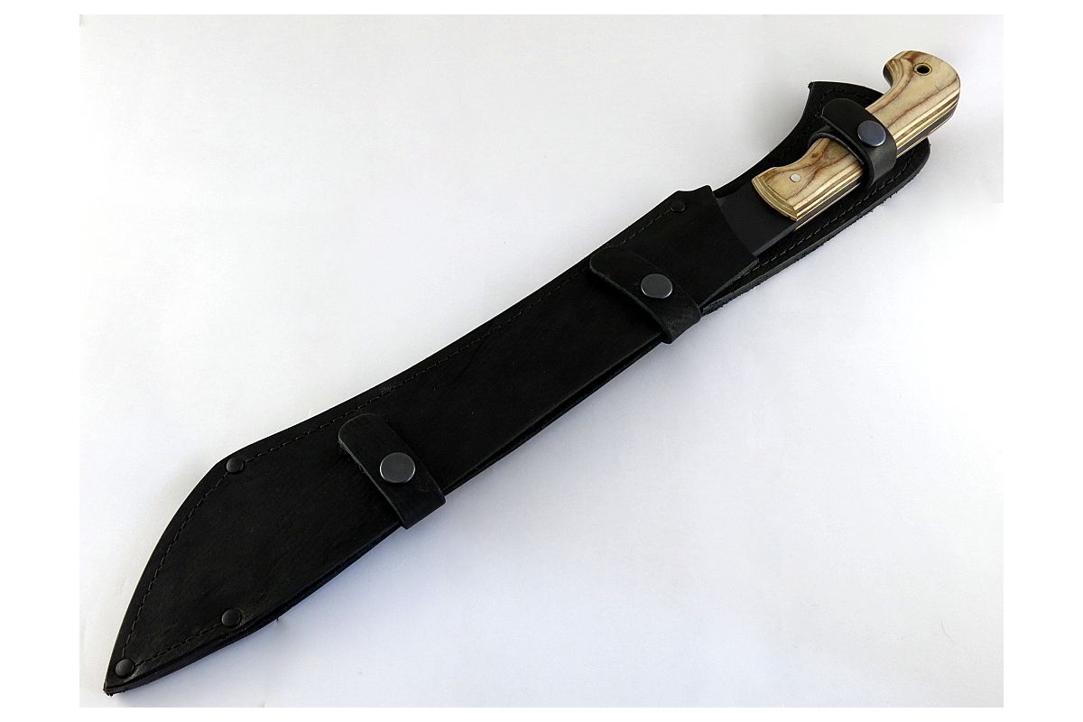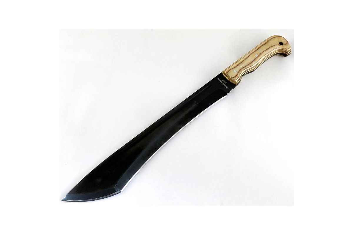 Мачете с мощным клинком из углеродистой стали, с накладной рукоятью из влагостойкой бакелитовой фанеры. Предназначен для туризма и экспедиций: рубка веток для костра, прокладка пути в кустарнике и т.п. Цельнометаллическая конструкция обеспечивает высокую прочность. Клинок изготовлен из углеродистой стали марки 65Г с защитным покрытием, твёрдость 56-57 HRC.