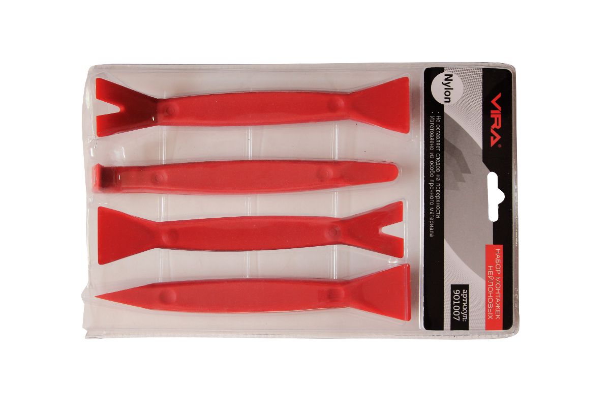Набор монтажек нейлоновых VIRA 4 шт., 901007. Набор используется для демонтажа элементов из различных материалов: резина, дерево, полимеры, стекло. Набор приспособлен для работ по дому и ремонту бытовых приборов. Отлично подойдет для автомобиля и демонтажа декоративных элементов. Все монтажки изготовлены из высокопрочного материала, не гнутся при работе. Особенность данного набора заключается в том, что изделия из нейлонового материала не оставляют следов на поверхностях. Это позволит проводить демонтаж любой сложности быстро и аккуратно.