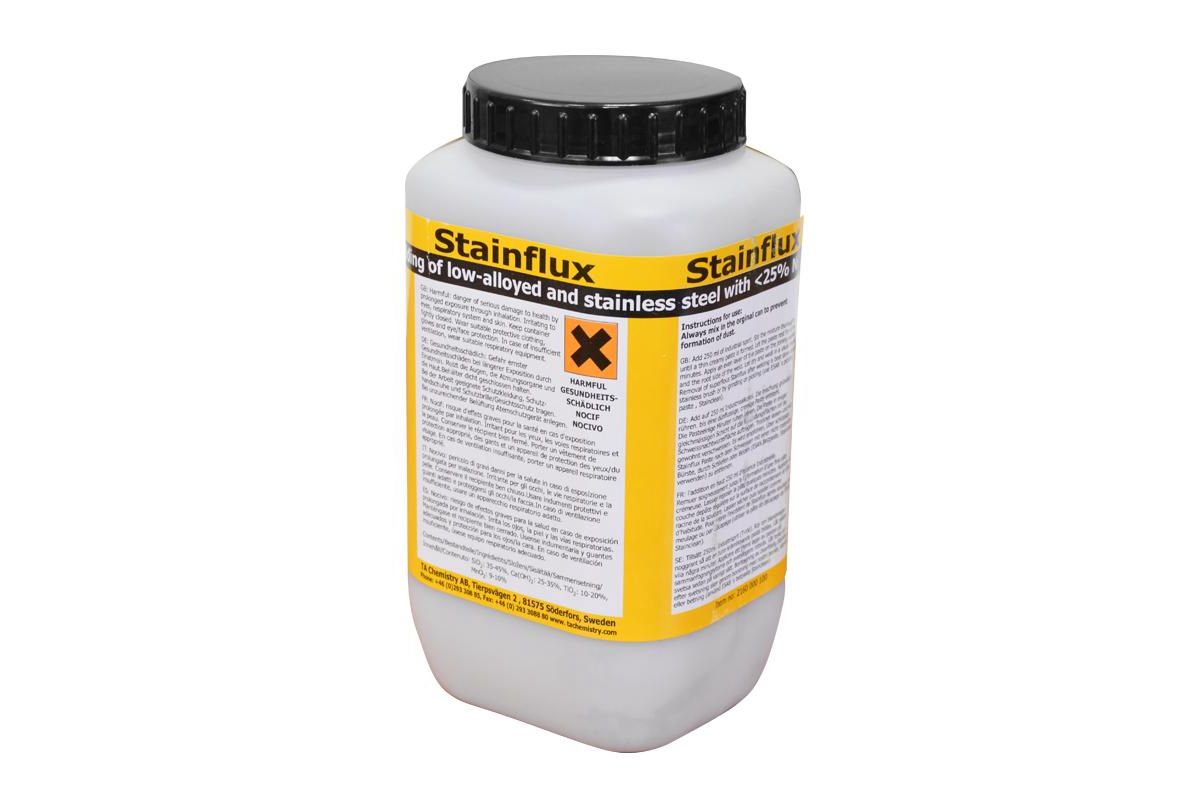Флюс STAINFLUX наносится на корень шва перед сваркойи обеспечиваетзащиту от окисления, которое происходит в течении сварки.STAINFLUX предназначен для использования при аргонодуговой сварке низколегированных и нержавеющих сталей с максимальным содержанием никеля 25%.STAINFLUX не предназначен для замены защитного газа.STAINFLUX поставляется в порошковой форме и смешивается с денатурированный этанолом перед сваркой.