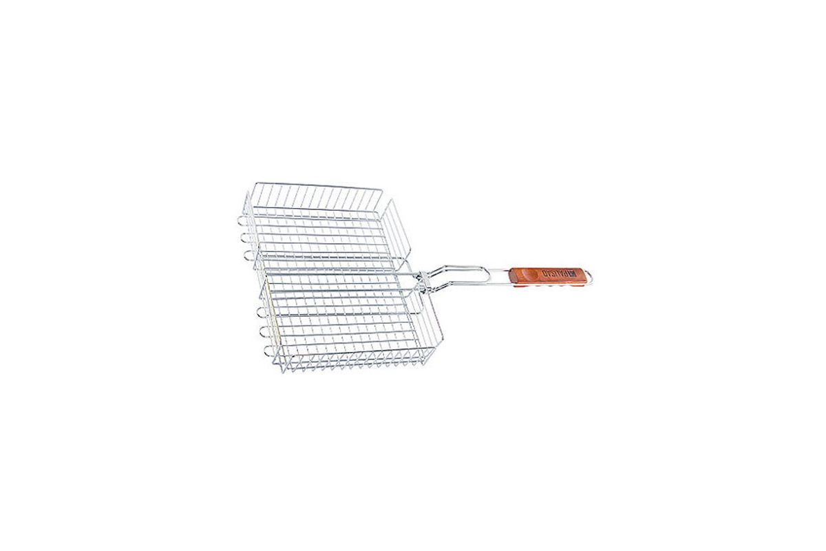 Высококачественная жаропрочная сталь. Эргономичная рукоятка. Широкое кольцо-фиксатор. Конструкция объемной решетки-гриль позволяет фиксировать верхнюю плоскость на разной высоте, поэтому на решетке можно запекать продукты различной толщины — от стейков до куринных окорочков, не передавливая их и оставляя сочными.