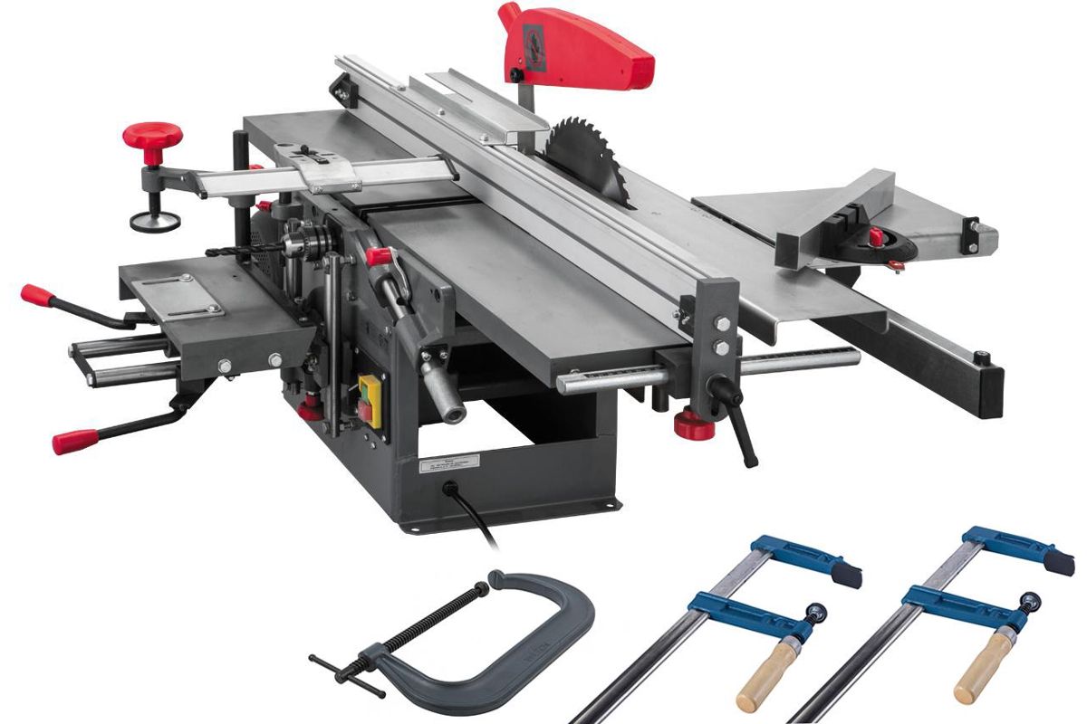 Деревообрабатывающий бытовой станок, имеющий крепкий корпус, надёжный электродвигатель (мощность 2,1 кВт), отшлифованные чугунные регулируемые столы для строгания, стальной оцинкованный стол для продольного пиления и каретку с упором, переставляющимся под различными углами от 0° до 45° для поперечного распила