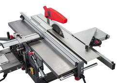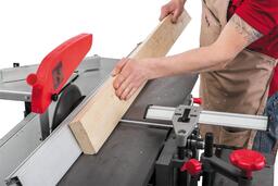 Преимущества модели - это мощный электродвигатель (2,1 кВт), просторный пильный стол, возможность регулировать наклон каретки и наличие удобных упоров.
