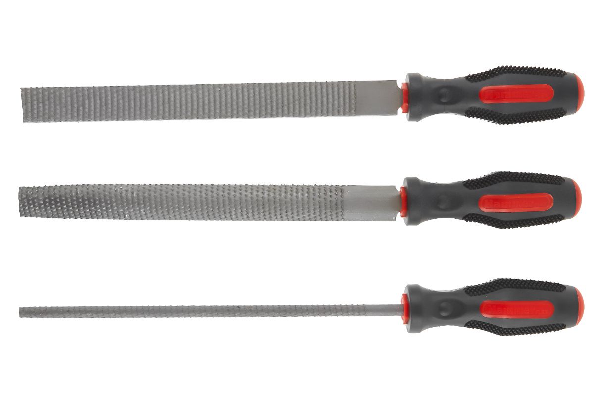 Пригодится для обработки древесины и выравнивания поверхностей деталей. В наборе три напильника: квадратный, круглый и полукруглый. Длина инструментов — 200 мм.