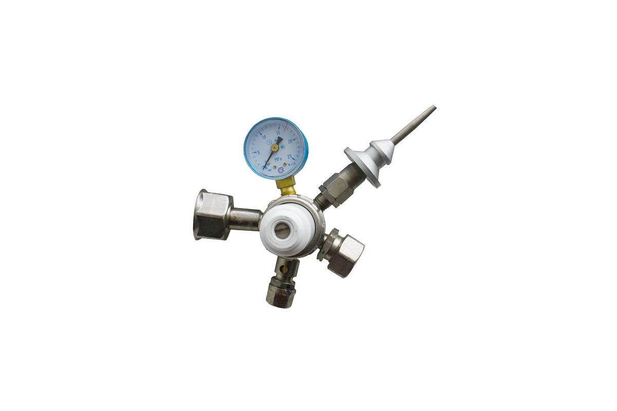 Редуктор, комплектуется двумя манометрами, контролирующими давление на входе и в камере рабочего давления.