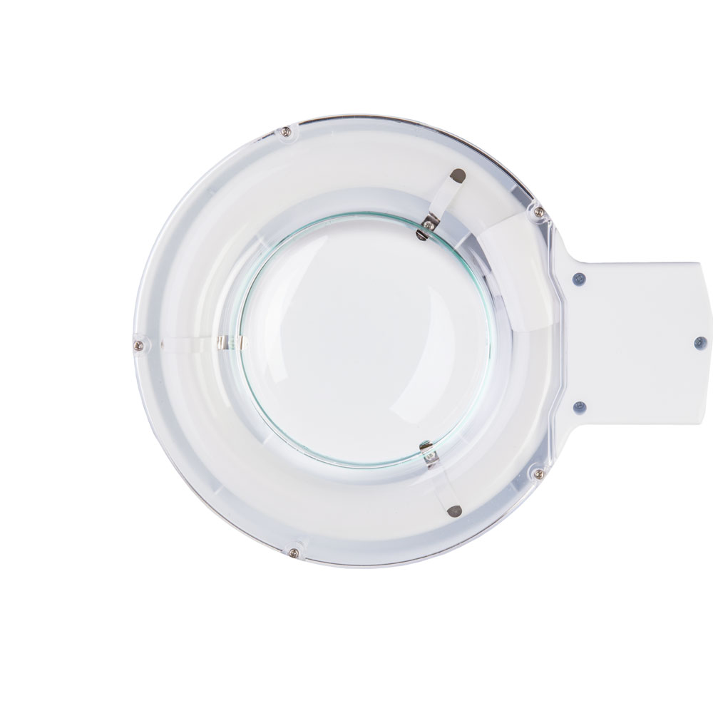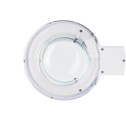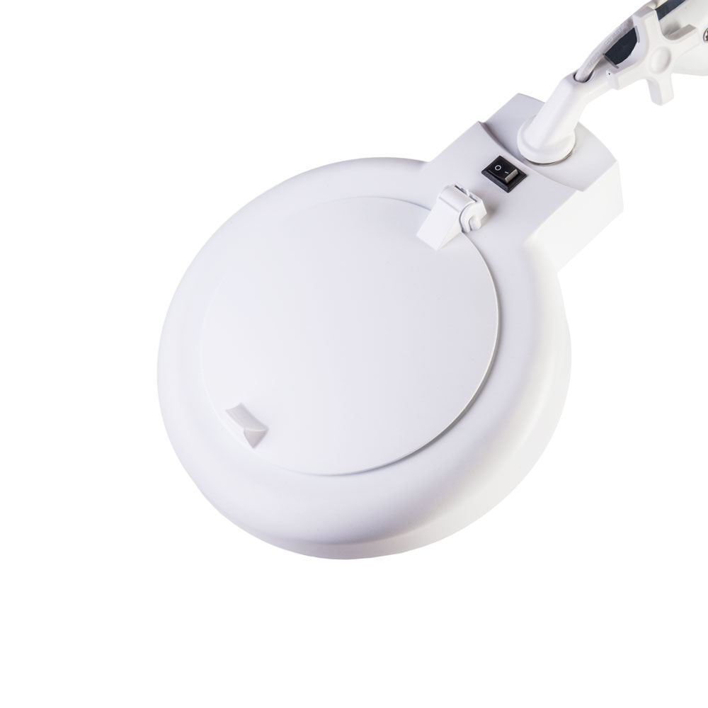 Настольная лампа-лупа 8608D 3D (220B) на металлической струбцине с люминисцентной подсветкой выполняет сразу две функции: дает ровное бестеневое освещение предмета и позволяет разглядеть самые мелкие детали с помощью стеклянной линзы ?127 мм с увеличением 1.75х (3 диоптрии). Лупа подойдет для выполнения профессиональных работ, занятия рукоделием, чтения, рисования или мелкого ремонта. Лампа-лупа может использоваться в косметологических салонах, в часовых и ювелирных мастерских, в лабораториях, в ремонтных и сервисных центрах. Может служить настольной лампой – для чего над лупой предусмотрена пластиковая крышка, также защищающая линзу от пыли. Лампа-лупа закреплена на металлическом поворотном штативе, конструкция которого дает возможность расположить лупу на расстоянии от 0 до 77 см над поверхностью столешни. Штатив устанавливается в металлическую струбцину, которая может закрепляться на плоских поверхностях толщиной до 7 см – столах, верстаках, полках и др. Струбцина снабжена мягкими накладками, чтобы не поцарапать поверхность стола.