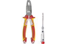 В состав набора входят: Кримпер FELO 58601840 диэлектрический инструмент для снятия изоляции 180мм, Отвертка FELO 36130000 тестер напряжения 3.0x0.8x65 220-250 в Инструмент служит для снятия изоляции с проводов со стандартной изоляцией. V-образное лезвие эффективно справляется с проволокой и гибкими многопроволочными кабелями с максимальным диаметром до 5 мм или сечением 10 мм?. Изделие имеет регулировку под необходимый диаметр проволоки или провода при помощи установочного винта. Система SystemClip защищает инструмент от падения с высоты. Эргономичный дизайн трехкомпонентной рукоятки обеспечивает ее оптимальное положение в руке пользователя. Отвертка тестер напряжения используется для определения фазы в электрике, а также проверки напряжения. Изделие состоит из хром-молибден-ванадиевого стержня и пластикового корпуса, атакже световой индикатор. Данный тестер не требует дополнительного источника питания.