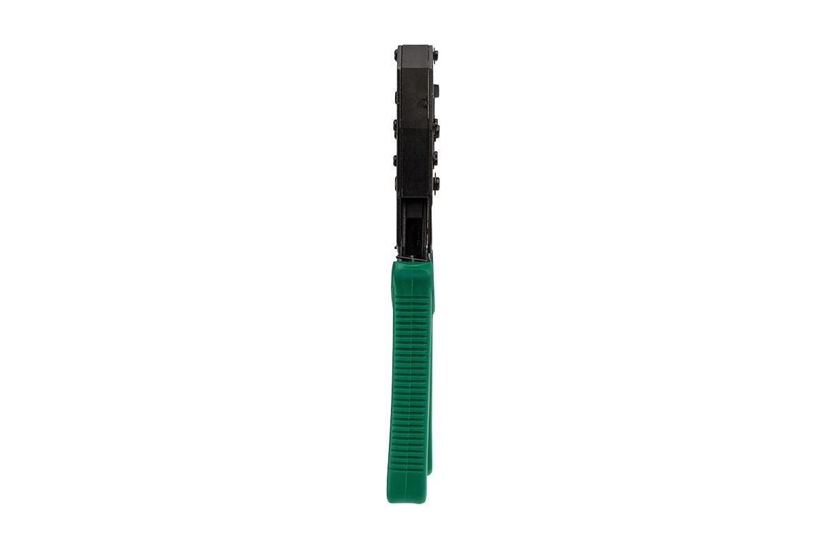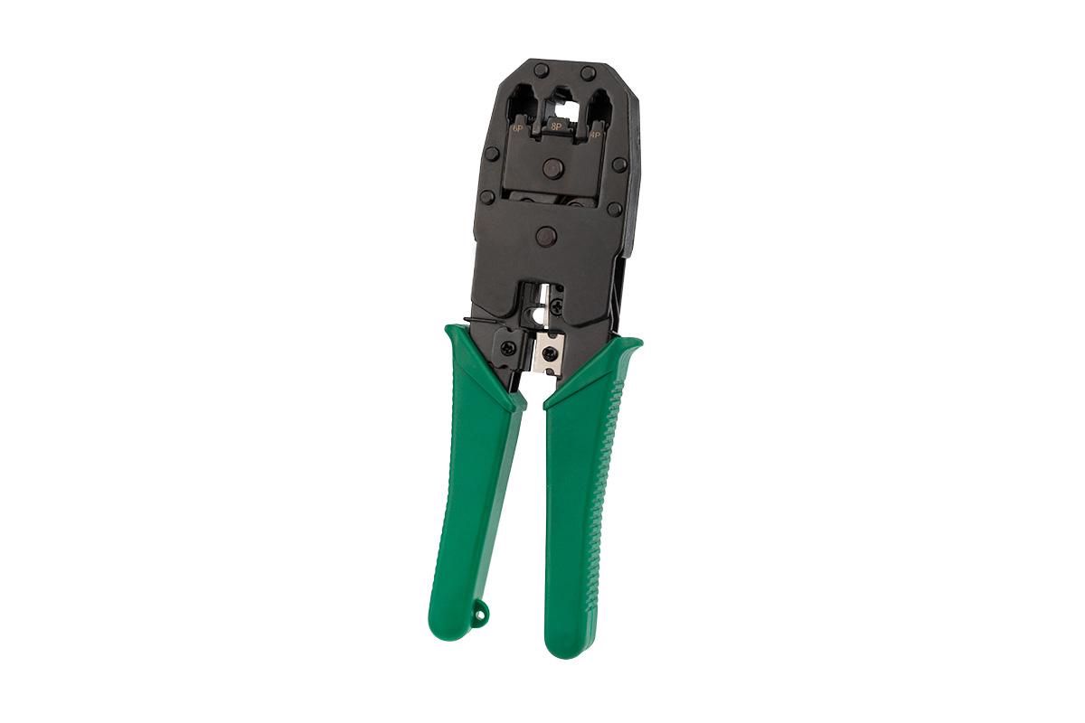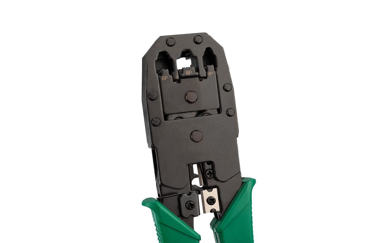 Универсальный инструмент для обжима разъемов RJ-45 (8P8C), RJ-12 (6P6C), RJ-11 (6P4C и 6P2C) и RJ-10 (4P4C), а также для снятия изоляции с плоских и круглых кабелей и для обрезки проводов.