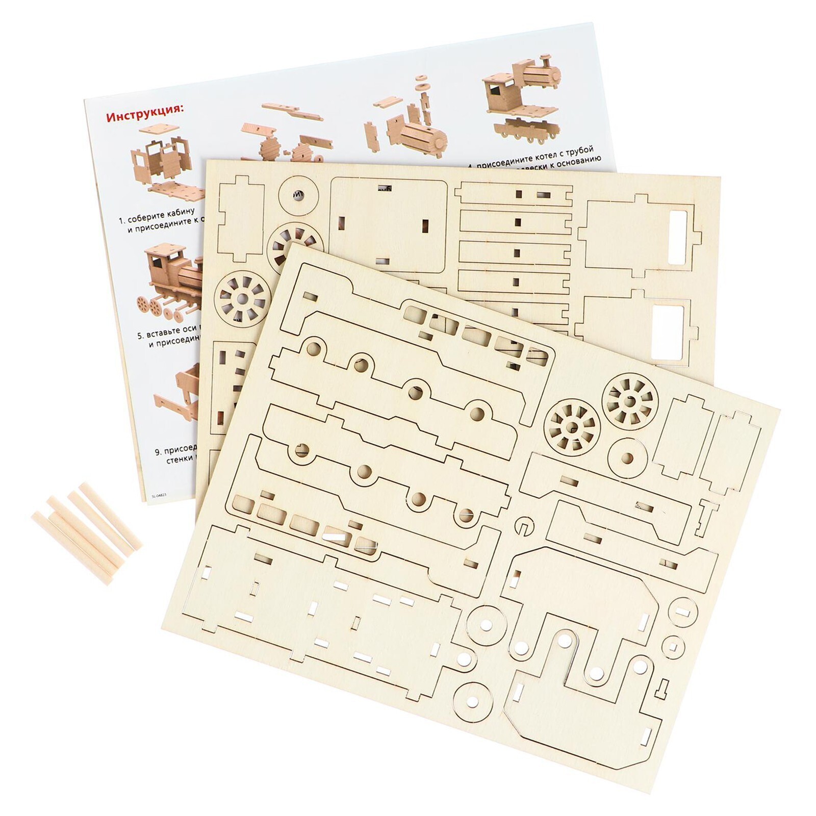Яркий конструктор состоит из листов фанеры с заранее вырубленными деталями, которые легко отделяются от основы.