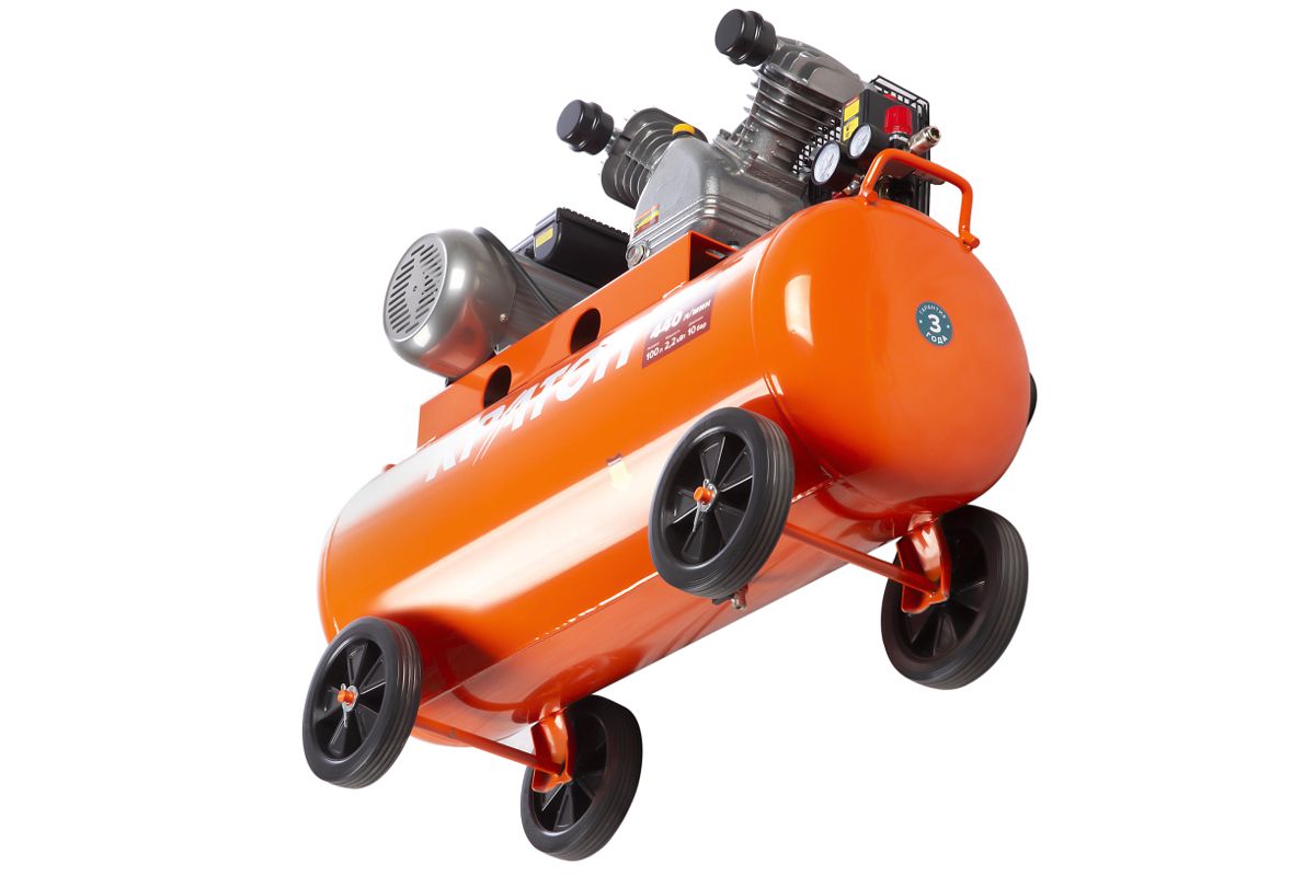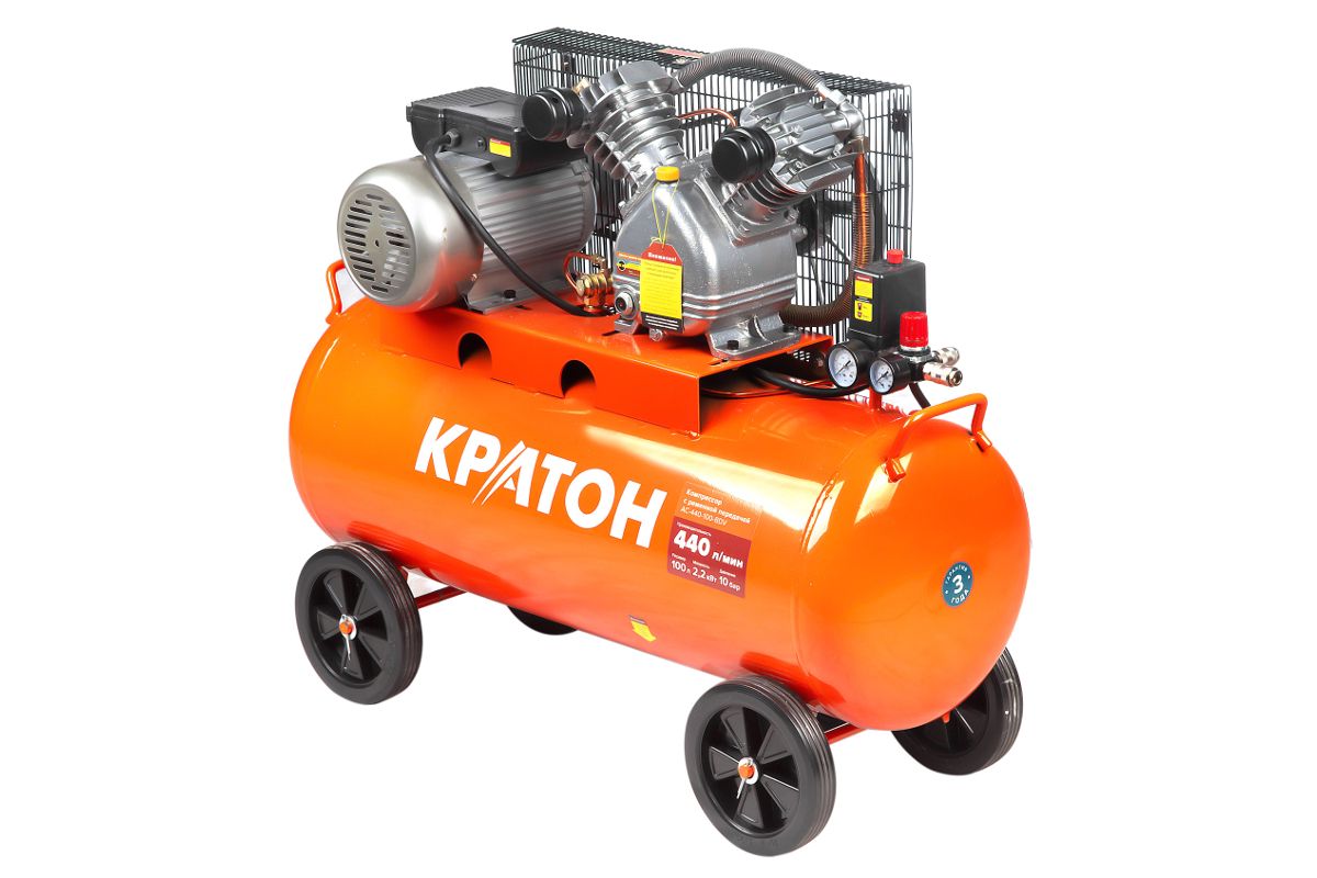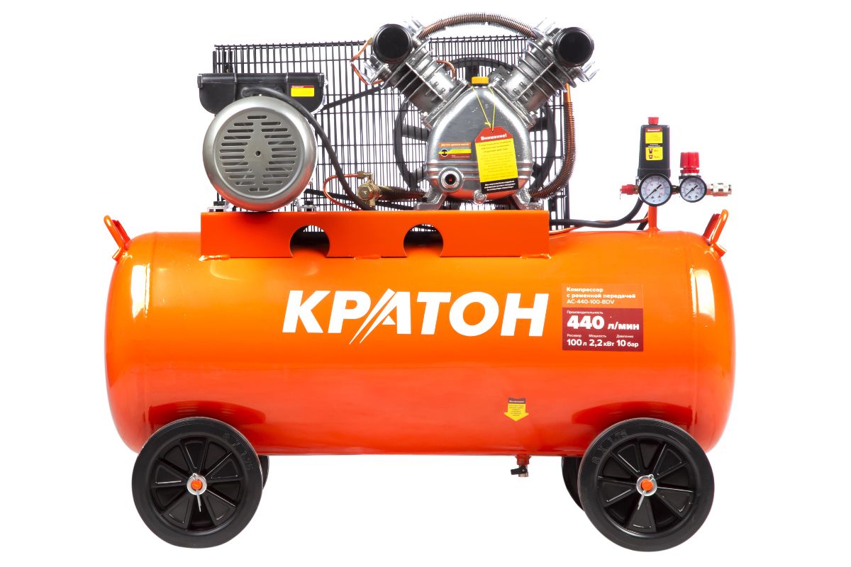 КРАТОН AC-440-100-BDV - поршневой маслянный компрессор с ременным приводом. Мощность двигателя - 2200 Вт, рабочее давление - 10 бар. Производительность - 440 л/мин. Подойдёт для мощного пневмоинструмента: дрелей, гайковёртов, шлифмашинок и т.д.