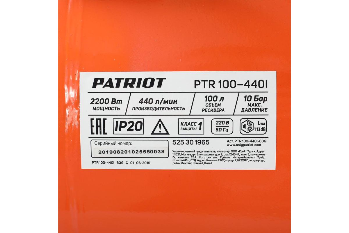 Компрессор PATRIOT PTR 100-440I поршн.ремен, 440л/мин, 10бар, 2.2кВт, 100л, быстросъем 1/4''+елочка