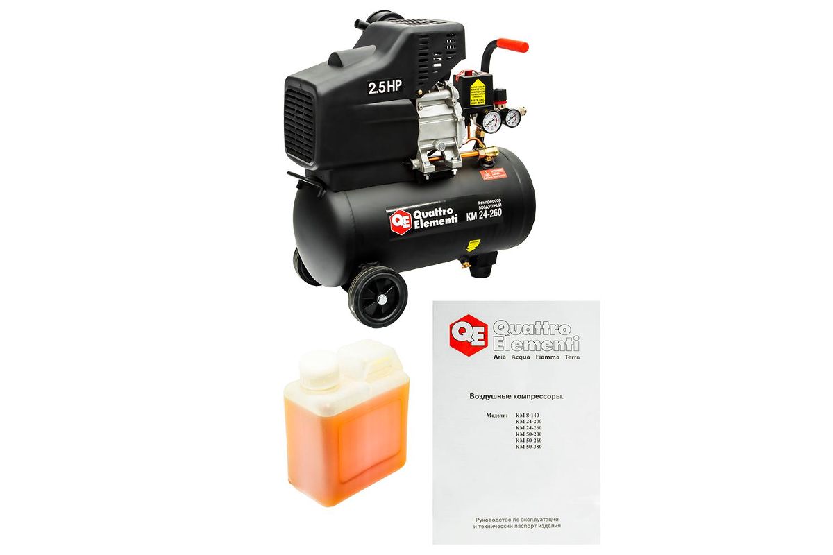 QUATTRO ELEMENTI 248-481 KM 24-260 – поршневой масляный компрессор для обеспечения пневматических инструментов сжатым воздухом. Производительность 260 л/мин. Подойдёт для работы с краскопультами, дрелями, продувочными пистолетами и т.д.