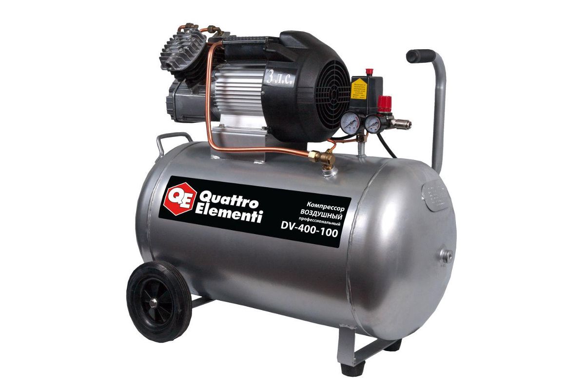 У компрессора QUATTRO ELEMENTI 771-718 DV-400-100 объемный ресивер – 100 л. Максимально давление - 8 бар. Подходит для работ на даче, производстве, в гараже. При двигателе в 2250 Вт производительность 400 л/мин.