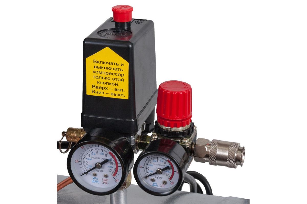 Два манометра и регулятор давления – настраивайте компрессор в зависимости от подключенного инструмента и типа работ.
