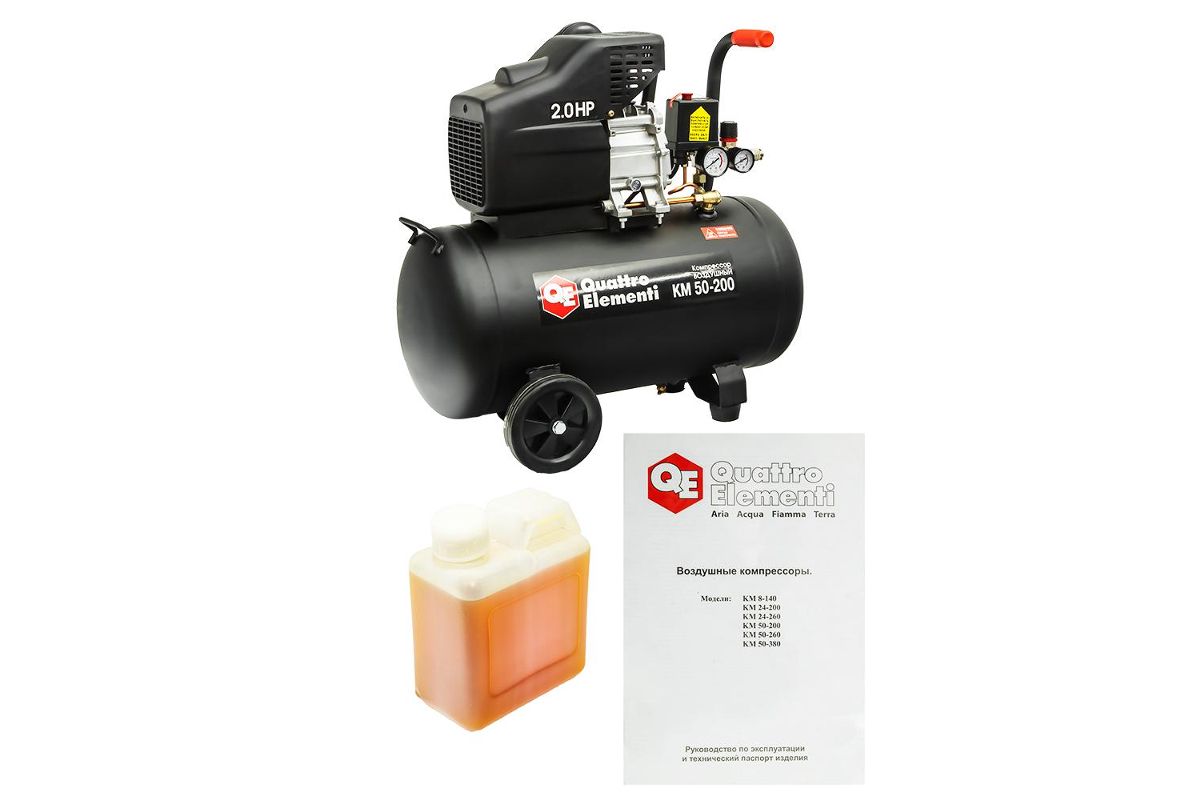 QUATTRO ELEMENTI 248-474 KM 50-200 – воздушный компрессор с прямым приводом. Производительность 200 л/мин. Совместим с маломощными пневмоинструментами: краскопультами, аэрографами, продувочными пистолетами и т.д.