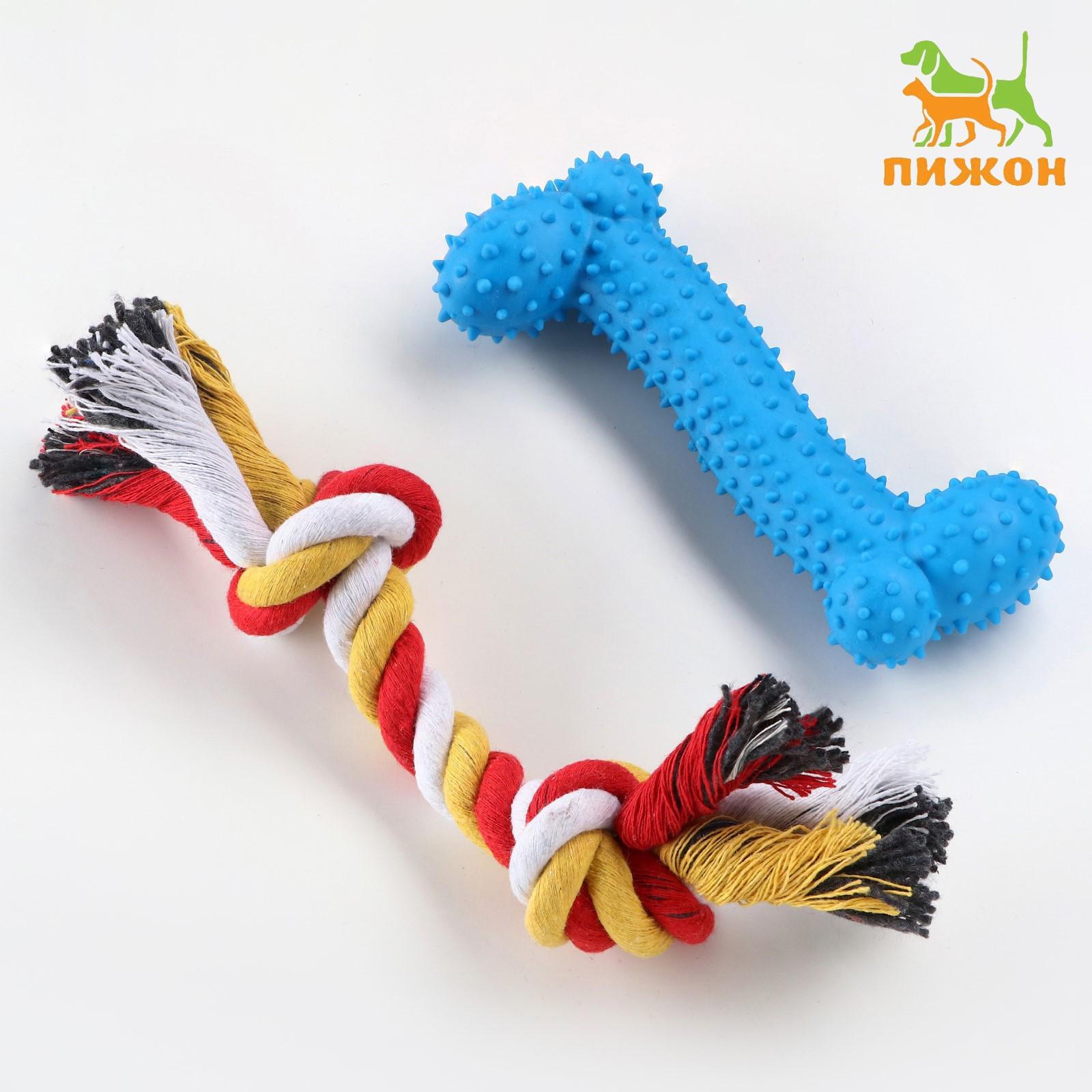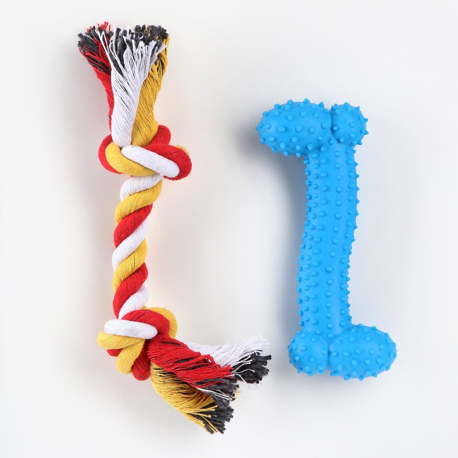 Набор игрушек для средних собак "Кость (16 см) и канат (90-100 г)",голубая