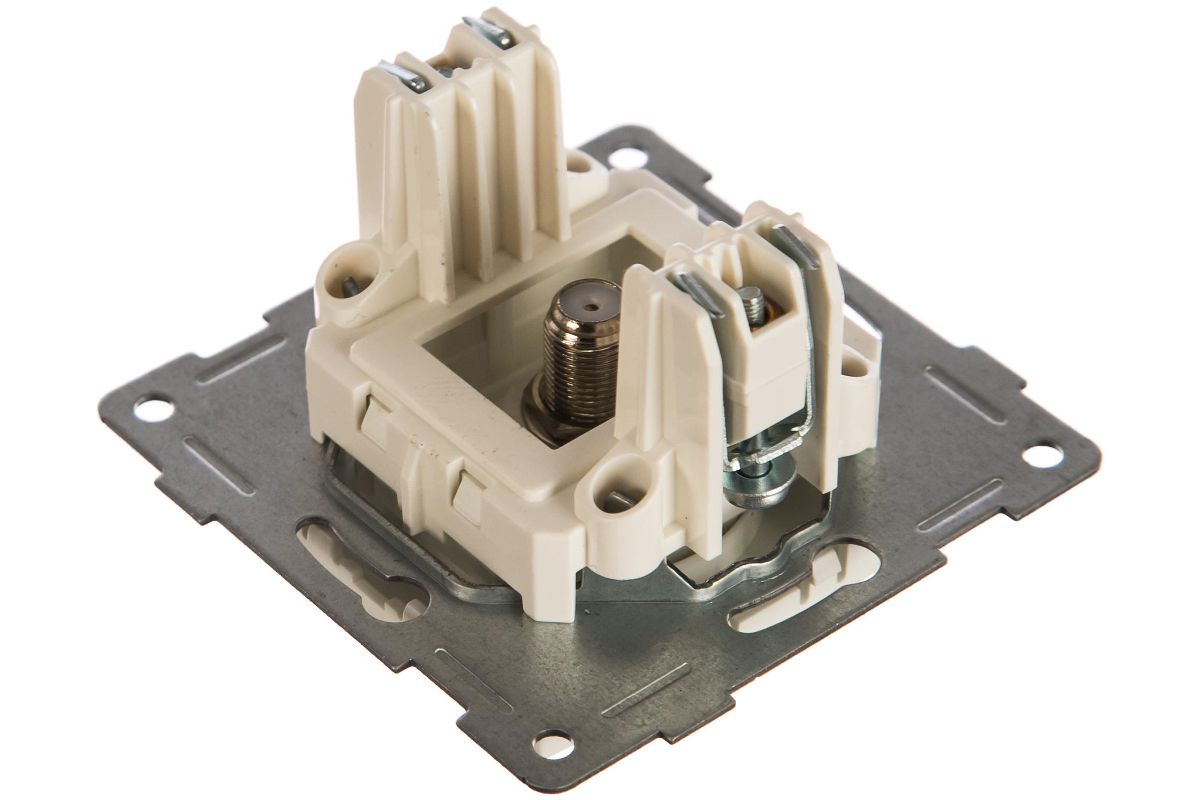Механизм антенной розетки для скрытой установки. Предназначена для подключения радио- и телевизионных приемников, которые используются для приема эфирных или спутниковых, аналоговых или цифровых сигналов. Установка в сети типа ''шлейф'' в качестве оконечной.