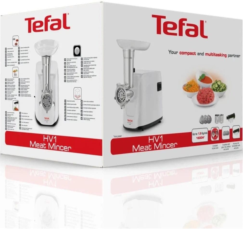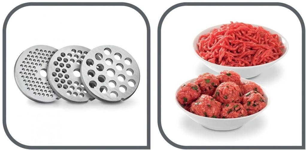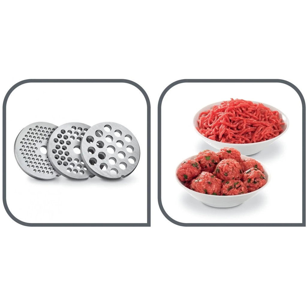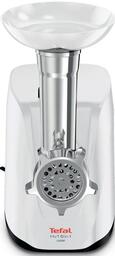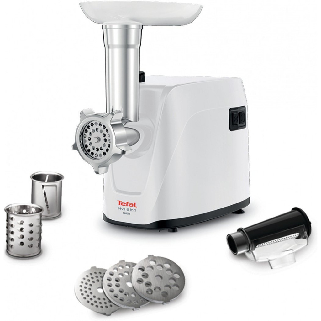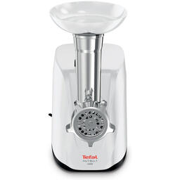 Багатозадачна електрична м'ясорубка Tefal NE113135 допоможе реалізувати безліч кулінарних ідей, адже її комплектація передбачає набір додаткових насадок для переробки м'яса, овочів та ягід. Урізноманітнюйте домашнє меню, використовуючи різні грати для фаршу, а також терку, шатківницю та прес для соку. Усього за одну хвилину ця електром'ясорубка здатна переробити до 1,9 кг продуктів. Характеристики та можливості: Модель Tefal NE113135 відрізняє підвищену продуктивність та елегантний дизайн. Прогумовані ніжки забезпечують м'ясорубці хорошу стійкість, а опція реверс дозволяє працювати з волокнистими продуктами і позбавляє необхідності частого очищення пристрою. Управління приладом здійснюється одним рухом. Електром'ясорубка оснащена лотком, ножами, що самозаточуються, з нержавіючої сталі і металевим шнеком. Три робочі решітки та додаткові насадки дозволяють швидко подрібнювати різноманітні продукти для приготування котлет, паштетів, ковбаси, салатів та інших страв. Прилад легко знається, для очищення достатньо промити робочі елементи під проточною водою.