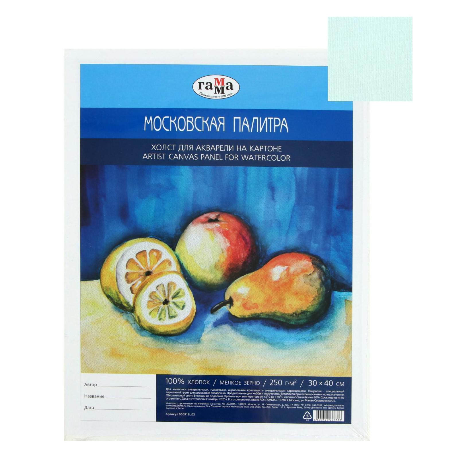 Акварельный холст на картоне ГАММА серии «Московская палитра», грунтованный, предназначен специально для живописи акварелью и акварельными карандашами, гуашью, акриловыми красками. Основа – натуральное полотно, 100% хлопок, мелкое зерно. Холст прямоугольной формы плотностью 250 г/м2, размер – 30 x 40 см. Холст покрыт специальным акриловым грунтом для акварели. Холст отлично подходит для техники по-сырому, не деформируется в отличие от бумаги. Изготовлен без использования кислот.