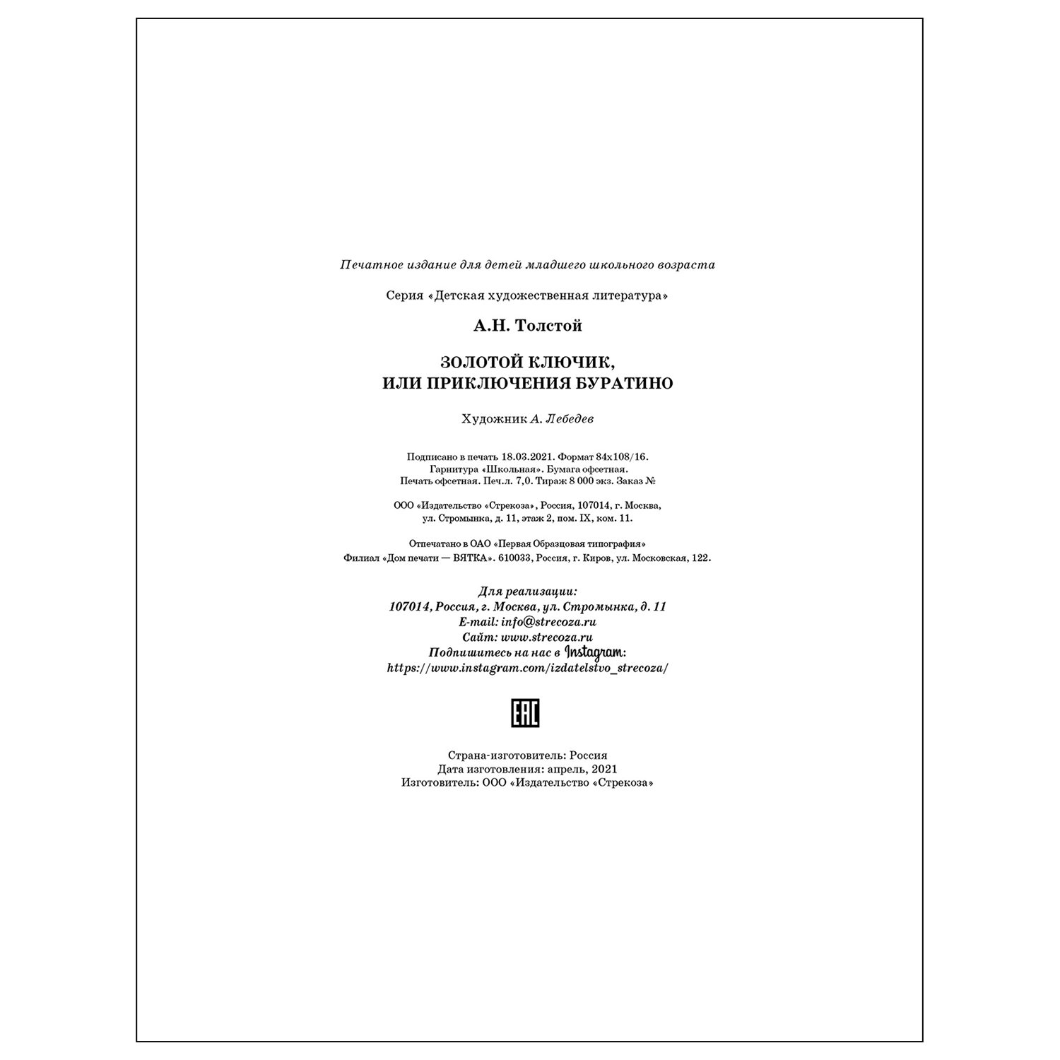 Книга СТРЕКОЗА Золотой ключик или Приключения Буратино 9677