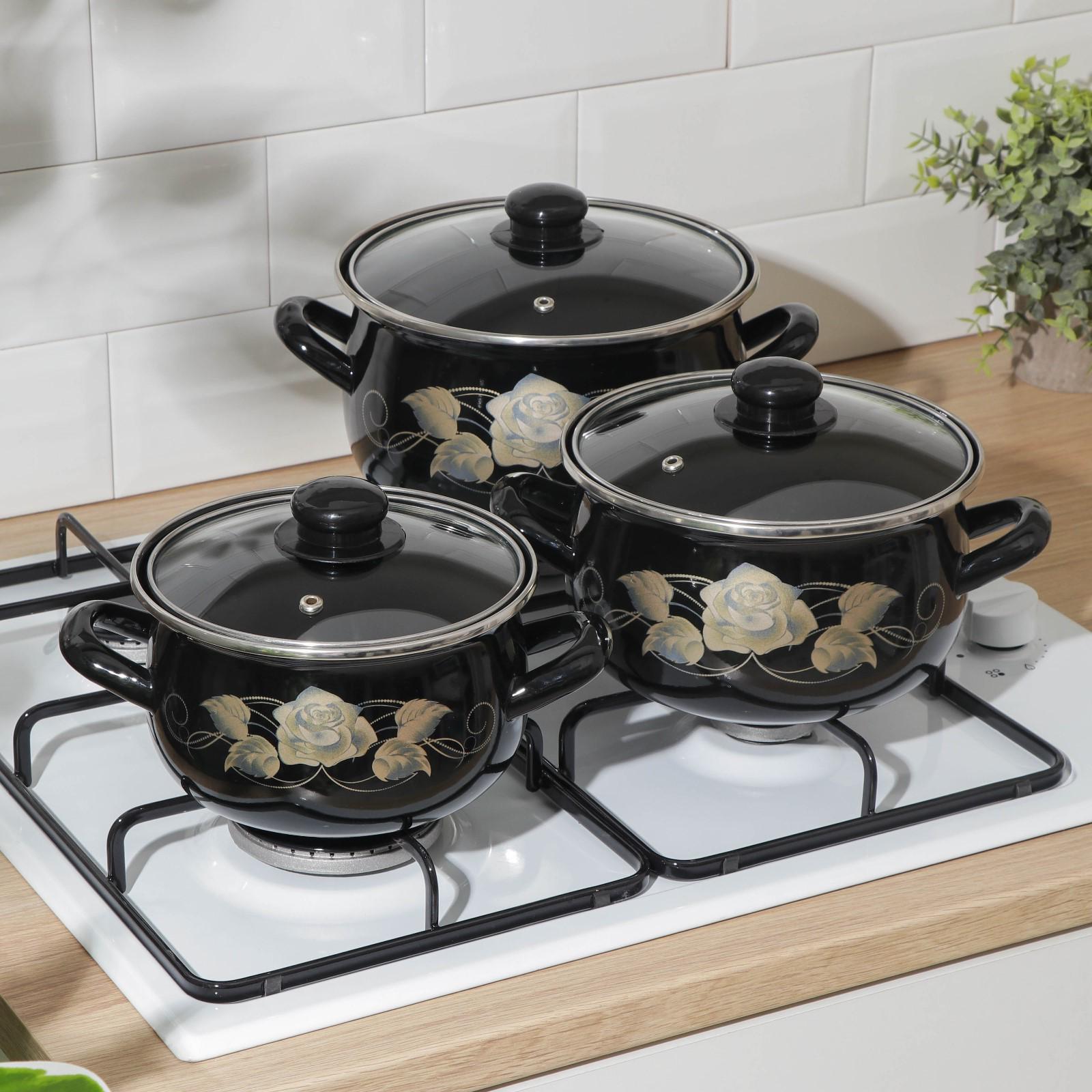Набор кастрюль «Чёрное золото», 3 предмета: 2,1 л, 3,1 л, 4 л, стеклянные крышки, индукция, цвет чёрный