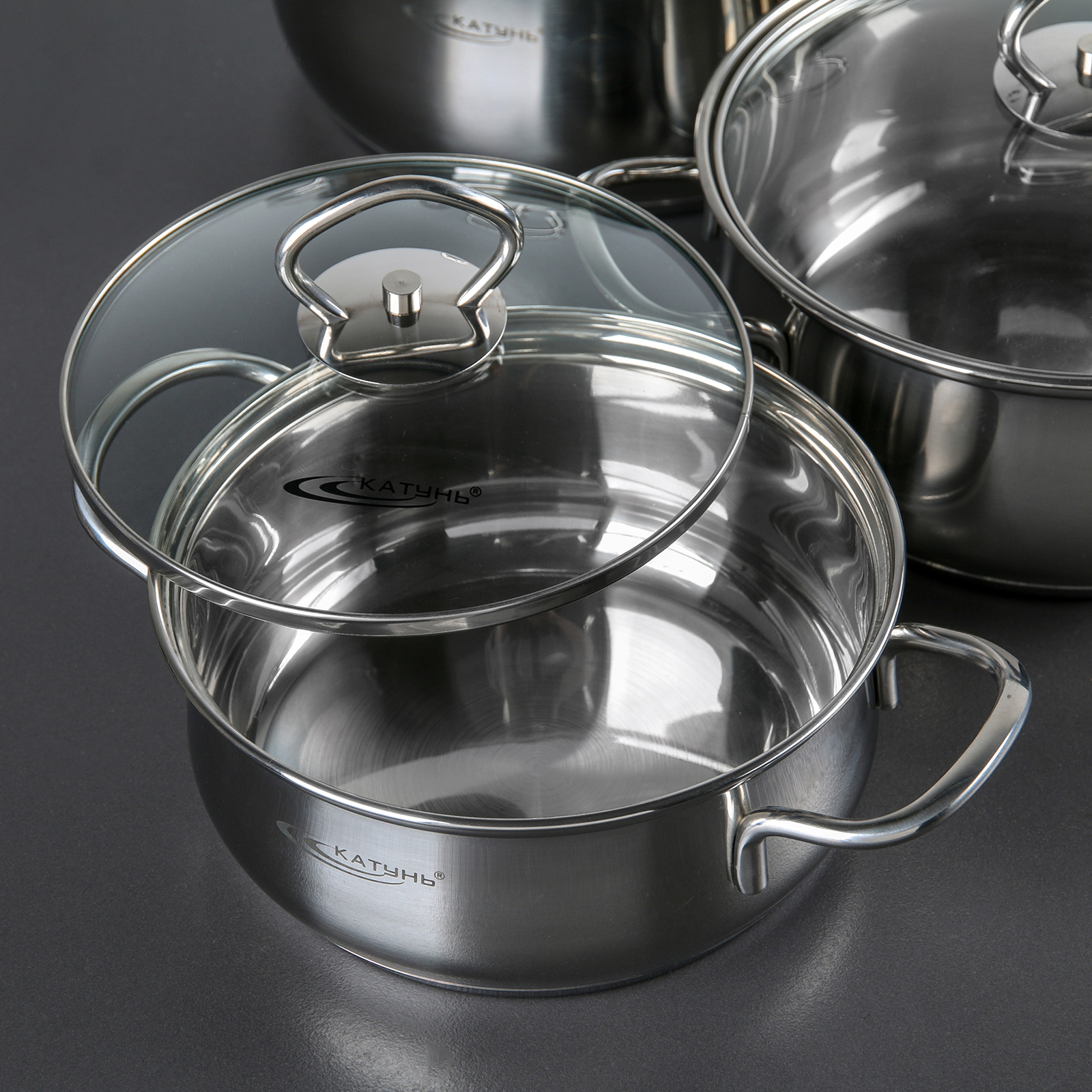 Набор кастрюль «Лира», 3 предмета: 1,6 л, 2,2 л, 3,2 л, крышки, капсульное дно представляет торговую марку "Катунь", заслужившую признание многих хозяек. Изделие грушевидной формы прошло зеркальную наружную полировку и, без сомнения, станет предметом гордости домашнего или профессионального кулинара. Прутковые ручки прикреплены по технологии точечной сварки. Толщина стенок составляет 0,5 мм, дна — 2 мм. Термоаккумулирующее дно кастрюли, подходящей для любых видов плит, представляет собой многослойную конструкцию с алюминиевой пластиной. Благодаря такому строению ваше приобретение, в отличие от аналогов с монолитным дном, будет заметно лучше распределять тепло по рабочей поверхности.