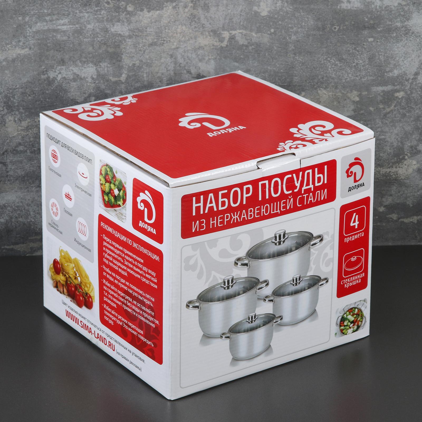 Набор кастрюль Доляна «Гретте», 4 предмета: 1,5 л, 2 л, 3 л, 4 л, d=16/18/20/22 см, стеклянные крышки