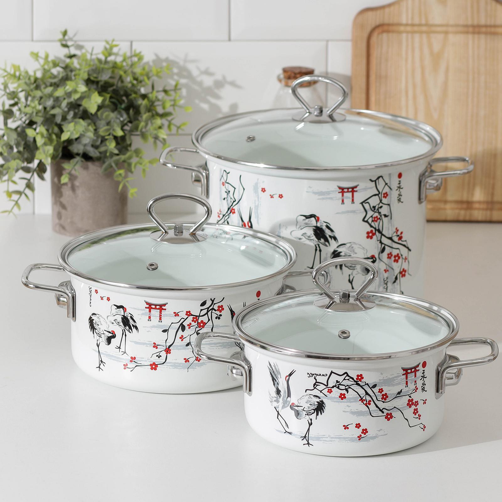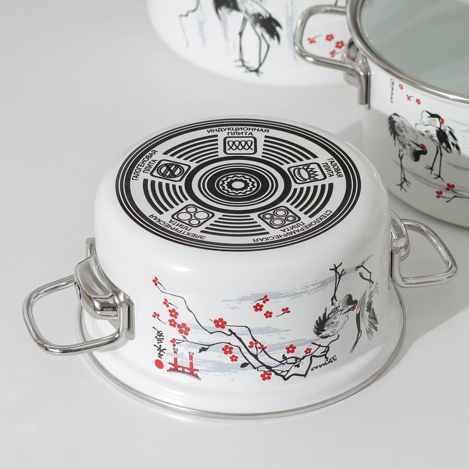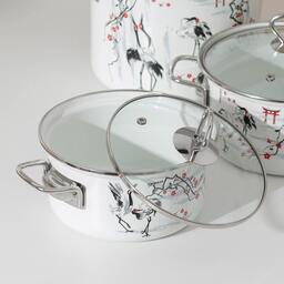 Набор кастрюль «Журавли», 3 предмета: 1,9 л, 2,5 л, 5 л, стеклянные крышки, индукция, цвет белый
