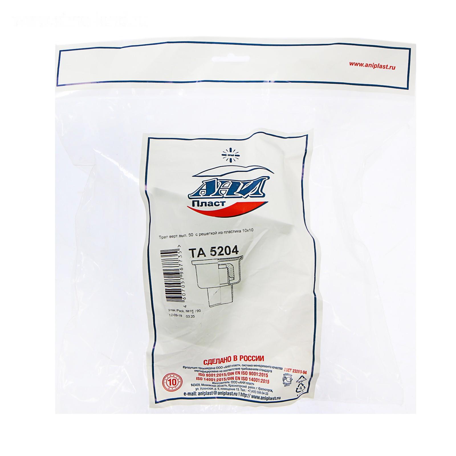 Трап "АНИ Пласт" TA5204, d=50 мм, вертикальный, решетка пластиковая, 100х100 мм