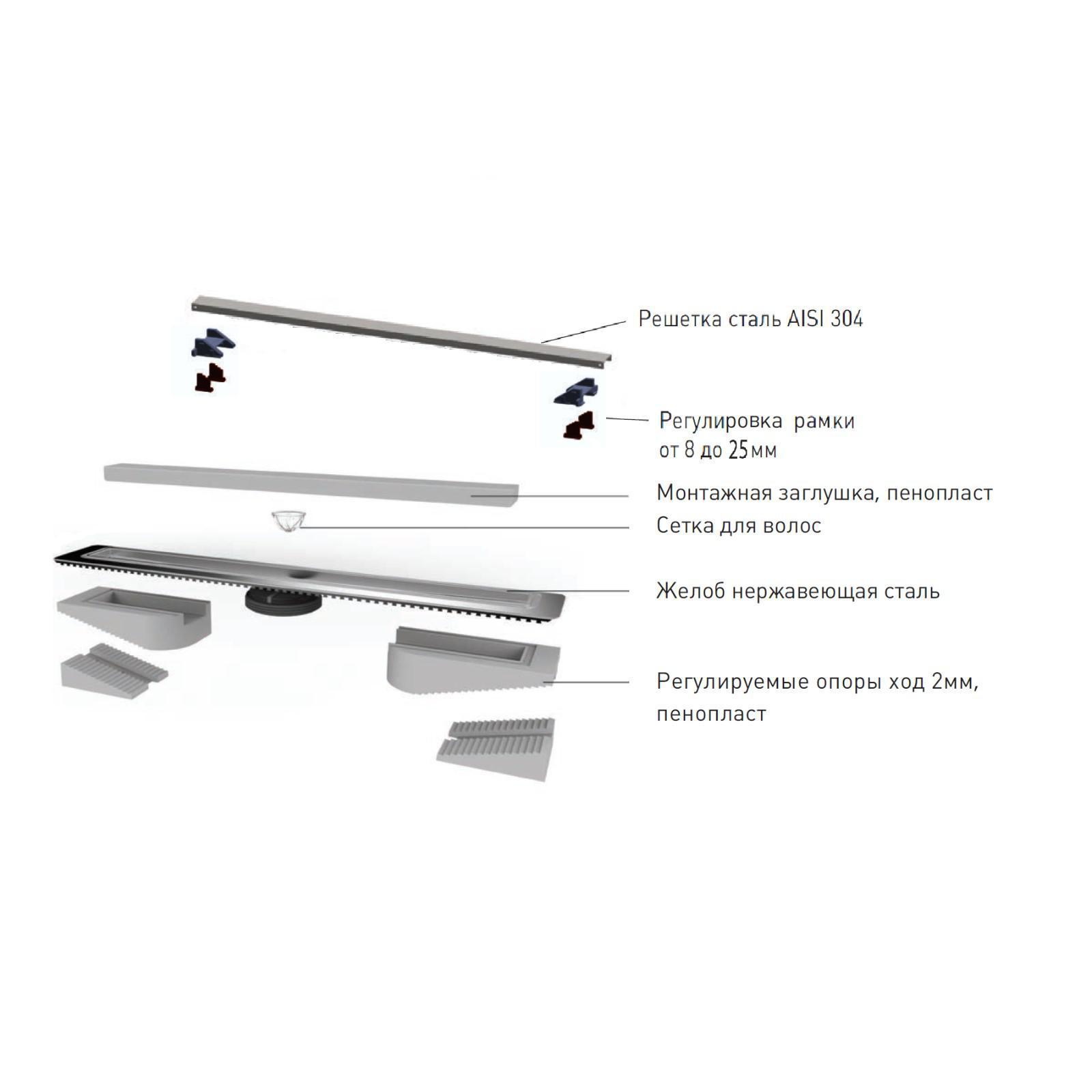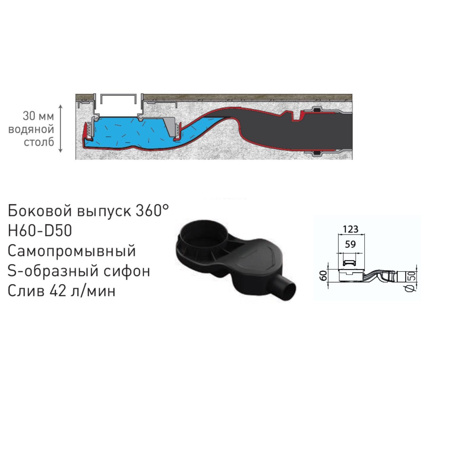 Трап BERGES C1 Norma 800, d=50 мм, 800 x 60 мм, линейный, боковой выпуск, матовый хром