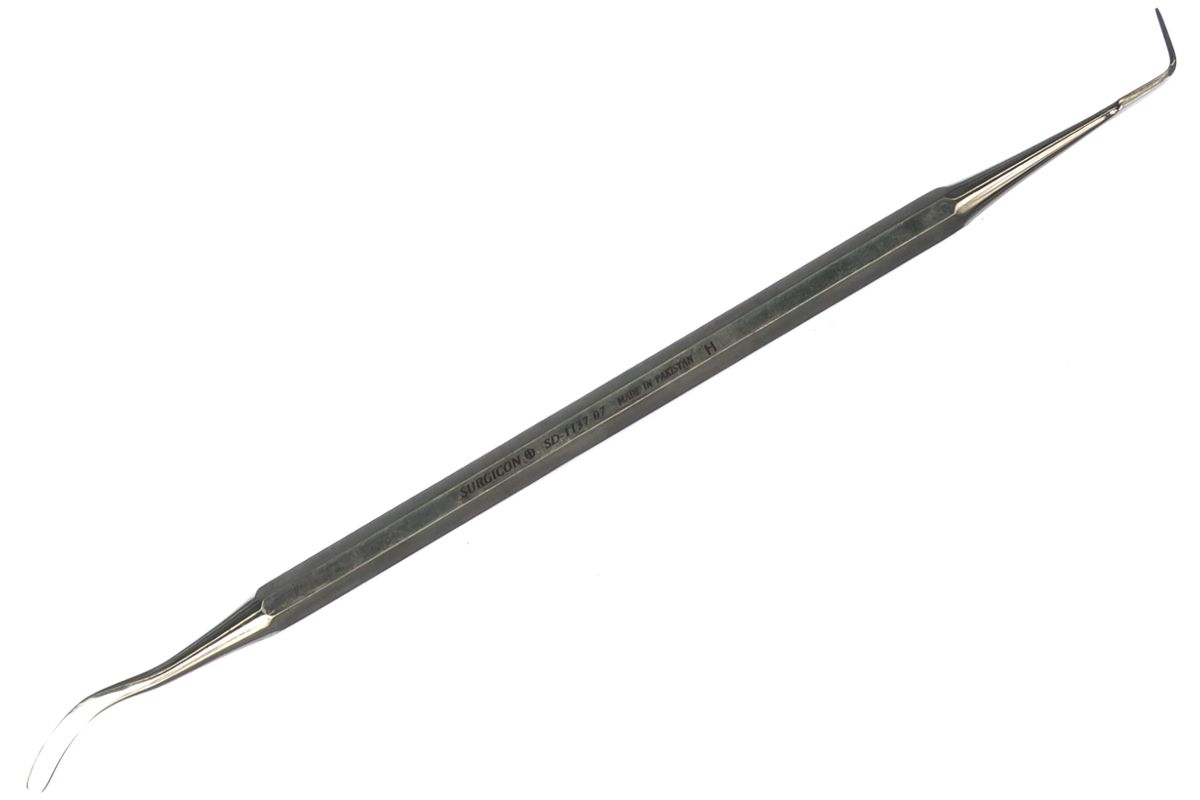 Монтажный инструмент имеет плоский конец в виде лопатки и заостренный изогнутый для выполнения разного рода задач. Данная модель используется самостоятельно без применения дополнительных устройств. Инструмент изготовлен из медицинской нержавеющей стали, что обеспечивает высокую устойчивость к ржавлению и деформированию.