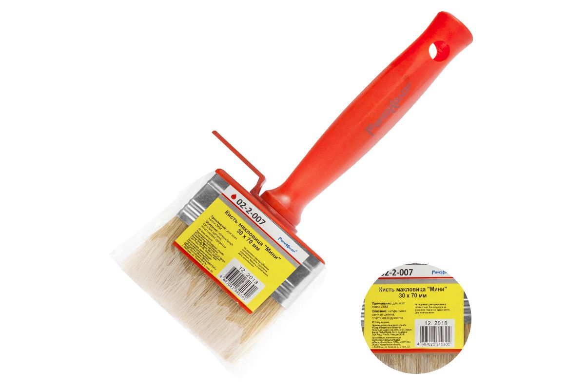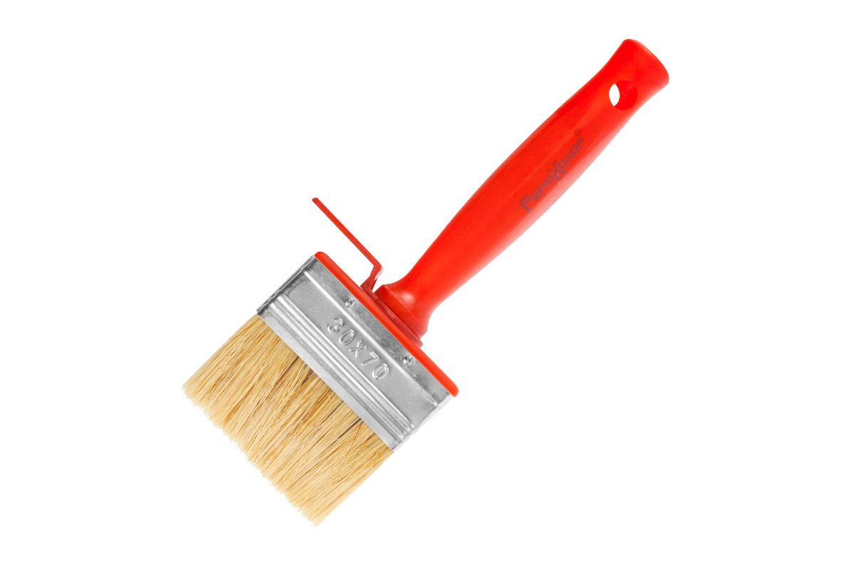 Кисть макловица РемоКолор Мини 02-2-007 имеет натуральную светлую прямоугольную щетину 70х30 мм. Пластиковая рукоятка имеет отверстие для подвешивания, так же предусмотрено использование удлинителя. Используют для нанесения обойного клея и известки, и для всех типов лакокрасочного материала.