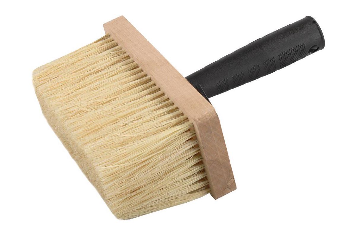 Щетина кисти состоит из растительного волокна в деревянном корпусе. Фиксатор у основания ручки служит для крепления макловицы на краю ведра при работе.