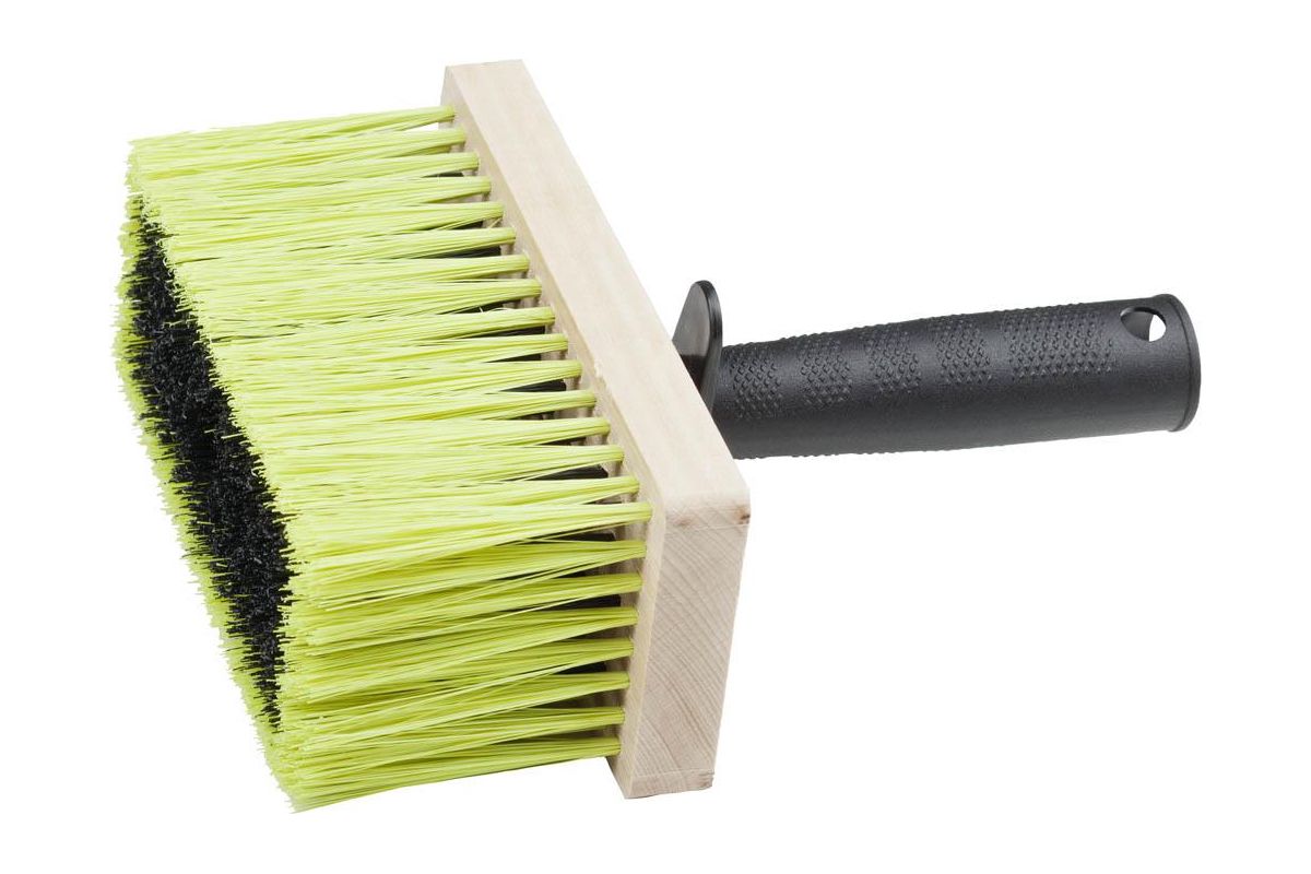 Искусственная щетина. Деревянная оправка. Пластмассовая ручка с возможностью закрепления на ведро и отверстием под удлинитель. Назначение: для клея, грунтовки и удаления старой побелки.