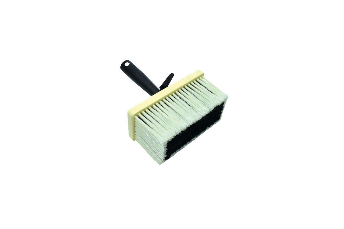 Ворс кисти — искусственная щетина, расщепленная на концах. Пластмассовая ручка с полостью для крепления телескопического стержня позволяет работать в труднодоступных местах. Предназначена для работ с воднодисперсионными, масляными красками и лаками. Кисть применяется для размывания ЛКМ, нанесения клеящих составов, грунтовки и побелки больших поверхностей. Размер кисти 70 х 170 мм.