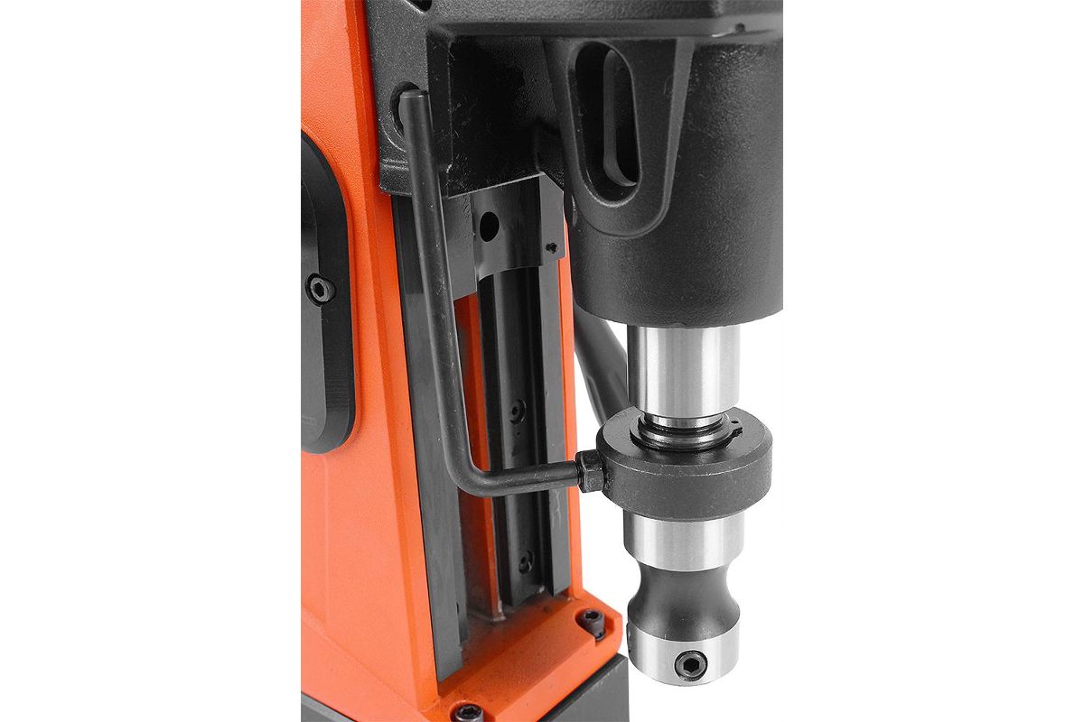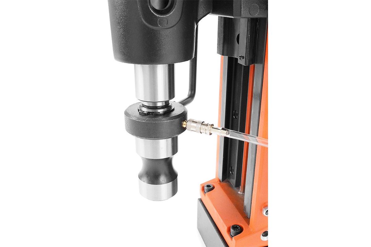 - Устройство работает кольцевыми и спиральными сверлами. Модель оснащена бочком для СОЖ, что позволяет качественно выполнять работу и продлить срок службы оснастки.