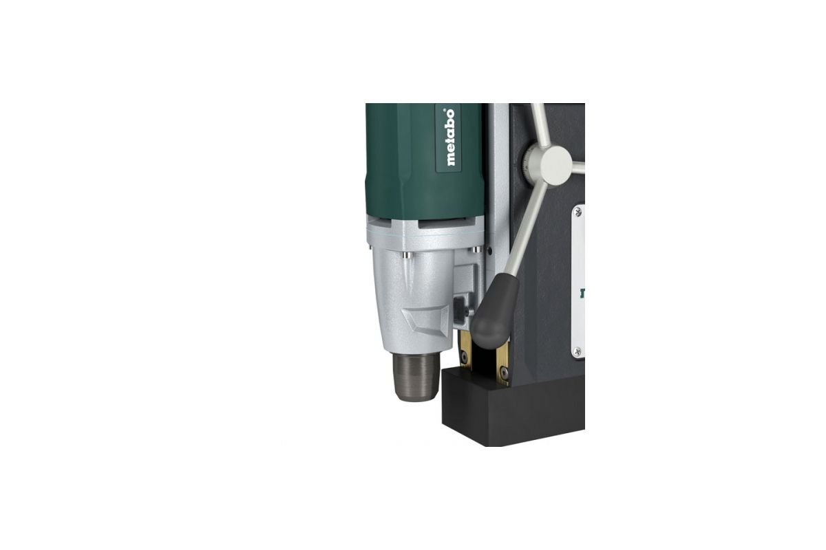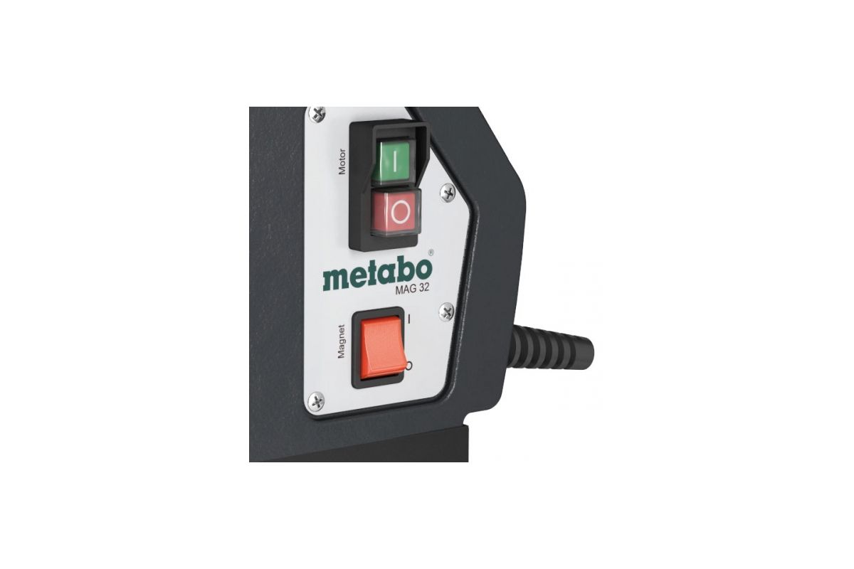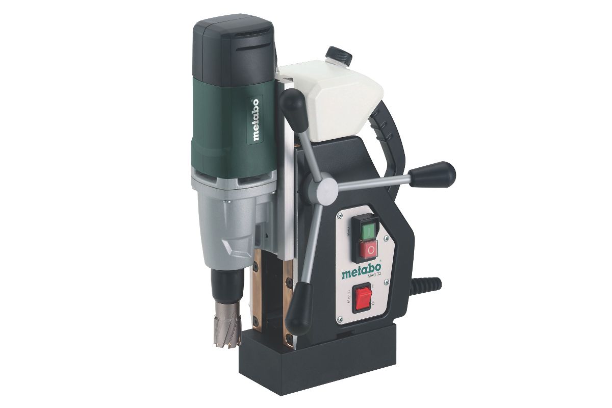 Магнитный сверлильный станок METABO MAG 32 — мощная переносная установка для сверления, оснащенная 1-киловаттным двигателем Metabo Marathon. Благодаря магнитному основанию может фиксироваться в труднодоступных местах: в частности, над головой или на вертикальной поверхности из металла. Удобен при ремонте и строительстве судов, крупногабаритной техники. Сверлит на глубину до 50 мм. При небольших оборотах (700 об/мин) развивает высокий крутящий момент — до 50 Нм. Для охлаждения сверл и коронок предусмотрено жидкостное охлаждение. Вес — 11 кг.