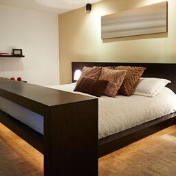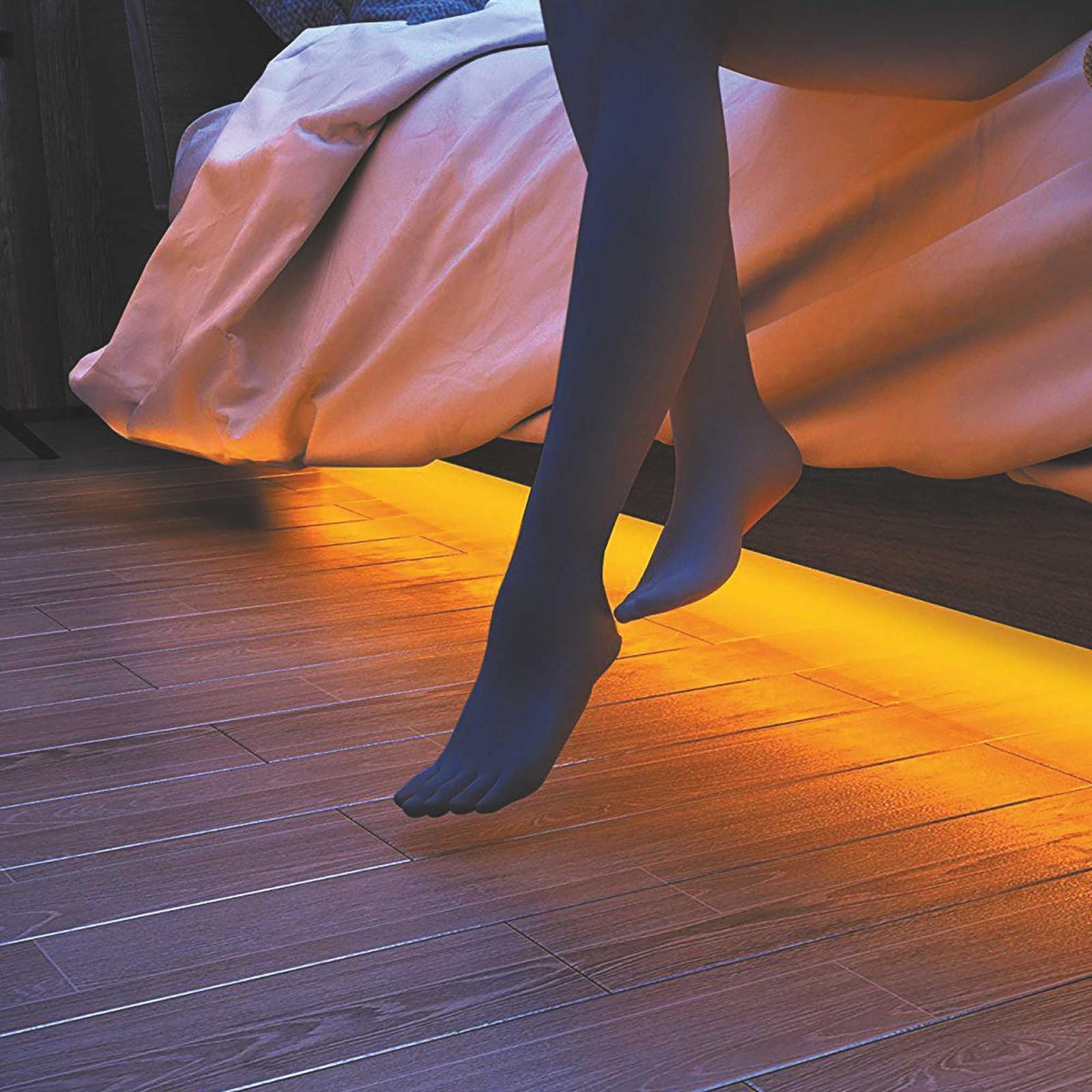 В состав готового комплекта для подкроватной подсветки входит 1,2 метра светодиодной ленты, которая работает от постоянного тока с напряжением 12В. Благодаря светодиодам smd 2835, которые излучают световой поток, лента является решением для воплощения в жизнь такого элемента декора, как прикроватная подсветка. Благодаря мягкому свету и датчикам создаёт комфортную обстановку, если нужно встать ночью. По сравнению с лампами накаливания светодиодная лента эквивалентна лампам мощностью 20 Вт. Данная модель светодиодной ленты обладает теплым белым цветом свечения с цветовой температурой 3000 К. Также в состав комплекта входит адаптер питания с вилкой в розетку на корпусе, проводом с выключателем и коннектором стандарта 5,5х2,5 для подключения светодиодной ленты, с другой стороны.
