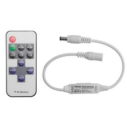 Контроллер укомплектован дистанционным пультом управления, передающим сигнал по радиоканалу, благодаря чему сам контроллер можно спрятать из зоны видимости, и он будет также качественно принимать сигнал от пульта и управлять светодиодной лентой. Управление осуществляется с помощью кнопок, расположенных на лицевой стороне пульта, который работает от 1-й батарейки CR2025. Накладной корпус контроллера, выполненный из пластика, благодаря миниатюрному размеру 40х12х5 мм, позволяет разместить его даже в профиле для светодиодной ленты.