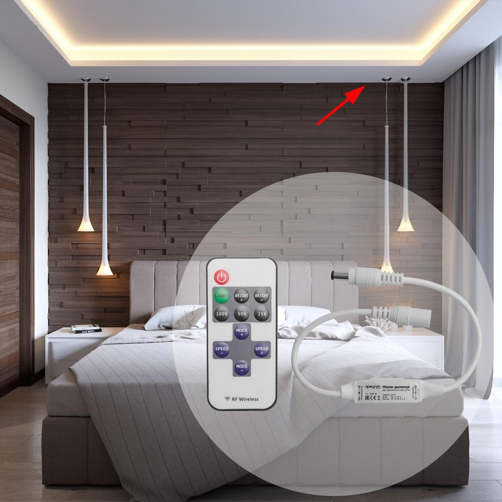 Мини-диммер предназначен для управления монохромной светодиодной лентой. С помощью него можно включать или выключать светодиодную ленту, отрегулировать ее яркость, а также использовать различные динамические режимы и отрегулировать скорость их работы. Одно из преимуществ данного изделия заключается в возможности работать от напряжения 12 В и 24 В, а значит его можно использовать со светодиодными лентами с соответствующим напряжением. Важно отметить, что в зависимости от того с каким напряжением предстоит работать устройству, будет отличаться и максимальная мощность нагрузки, которую можно подключить к нему. Так, при напряжении 12 В максимальная нагрузка будет равна 72 Вт, а при напряжении 24 В уже 144 Вт. Это значит, что к данному изделию вы можете подключить в два раза больше светодиодной ленты 24 В.