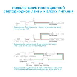 Данная модель светодиодной ленты является многоцветной. Каждый светодиод такой ленты имеет 3 базовых цвета: синий, зеленый и красный. В зависимости от используемого контроллера можно получить до 256 различных оттенков свечения. При выборе светодиодной ленты важно учитывать такой параметр, как потребляемая мощность, чтобы правильно подобрать блок питания. У данной модели этот показатель равен 14,4 Вт на один метр.