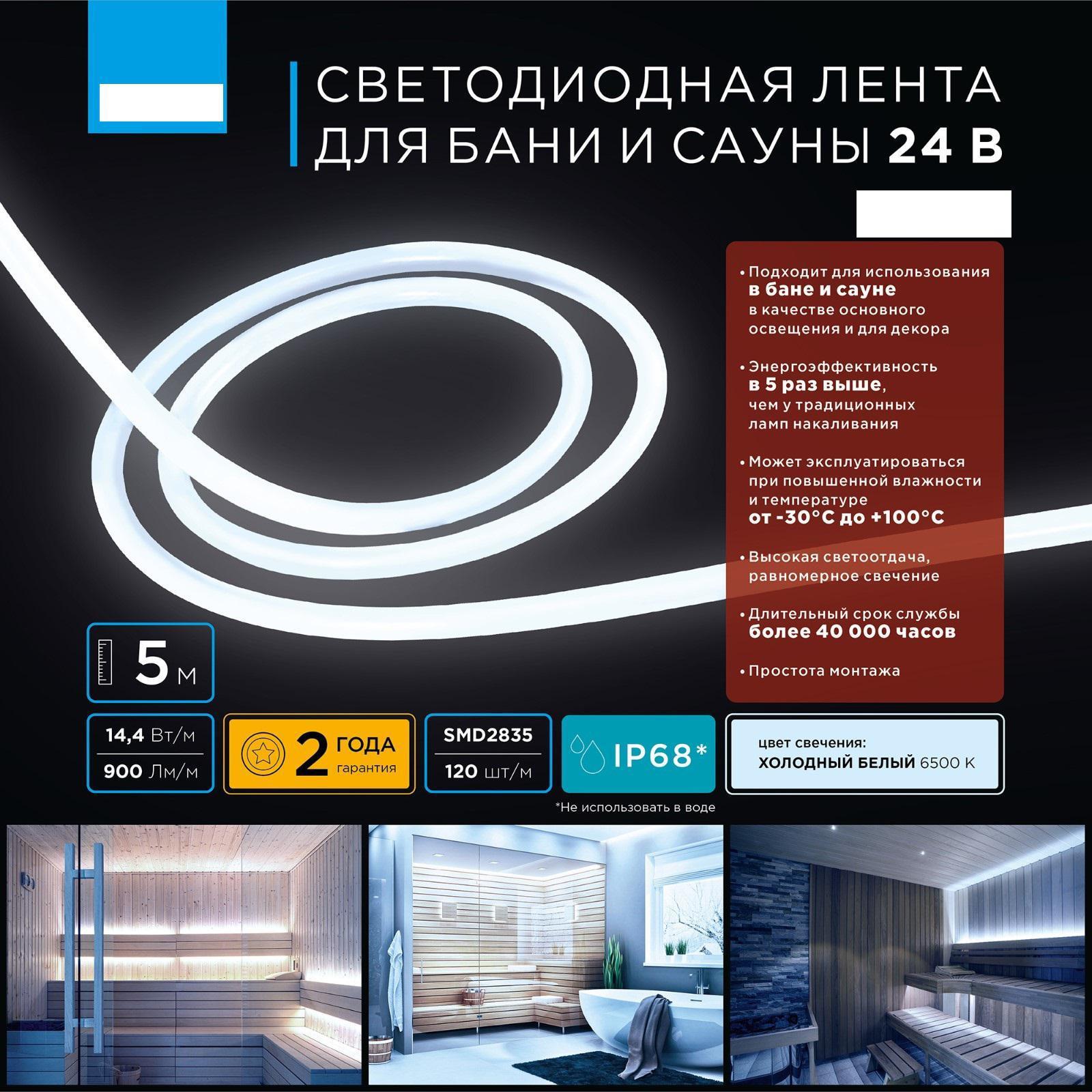 Светодиодная лента для бани и сауны работает от постоянного тока с напряжением 24В. Благодаря светодиодам smd 2835 излучающим световой поток равный 900 Лм/м лента используется для вспомогательной декоративной подсветки областей интерьерного пространства. Светодиодная лента эквивалентна лампам накаливания мощностью 90 Вт. Данная модель светодиодной ленты обладает холодным белым цветом свечения с цветовой температурой 6500 К. При выборе светодиодной ленты важно учитывать такой параметр, как потребляемая мощность, чтобы правильно подобрать блок питания. У данной модели этот показатель равен 14,4 Вт на один метр.