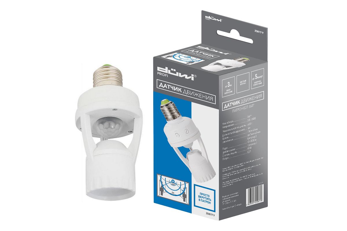 Датчик движения DUWI 25817 9 DDL-01 патрон E27 360 град, 60Вт, 10-300с, 6м, 3-2000Лк, белый