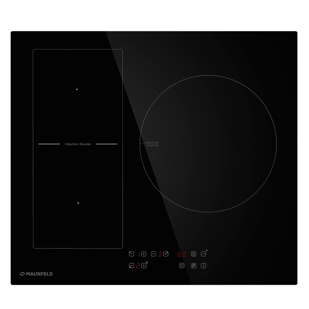 Панель варочная индукционная MAUNFELD CVI593BK2 (КА-00017397) выполнена из стеклокерамики. Имеет 3 конфорки различной мощности. Отличается высокими показателями качества и легко очищается. Сенсорное управление дает возможность:- регулировать уровень мощности с помощью слайдера (9 уровней);- включить функцию Бустер (максимальная мощность);- выставить таймер;- заблокировать панель от детей;- для крупногабаритной посуды использовать Flex Zone.Эксплуатацию варочной поверхности значительно упрощает:- Индикатор остаточного тепла - укажет, какая из варочных зон ещё горячая.- Детектор диаметра посуды - экономит электроэнергию, нагревая только необходимую полезную поверхность конфорки.- Индикатор наличия посуды показывает, что посуда отсутствует на конфорке или не подходит для использования в режиме индукции.- Вывод сообщения об ошибке при сбое работы плиты.- Автоматическое отключение в случае перегрева, долгого простоя работающей конфорки и при намокании поверхности варочной панели.