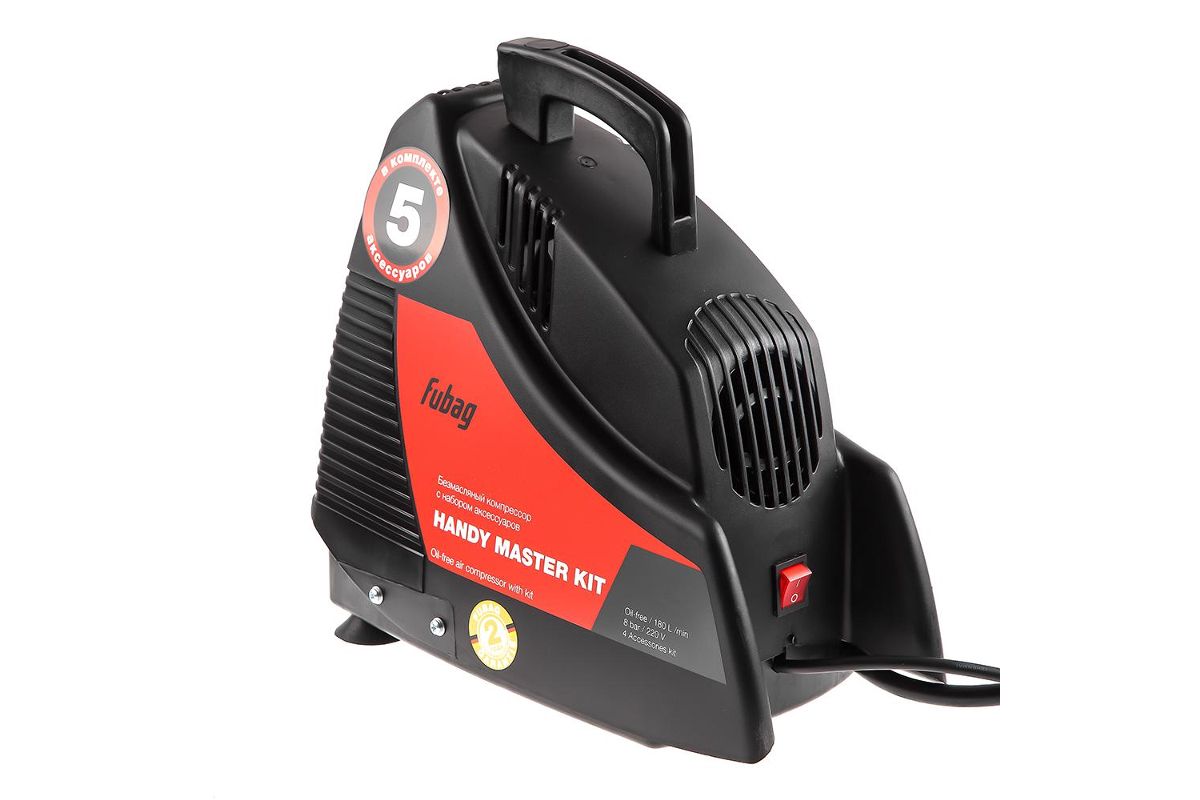 Набор FUBAG HANDY MASTER KIT состоит из воздушного компрессора и комплекта из 5 инструментов. Мощность - 1100 Вт, производительность – 180 л/мин. Пригодится в гараже или на даче для подкачки шин, продувки техники и полостей, работы аэрографа и т.д.