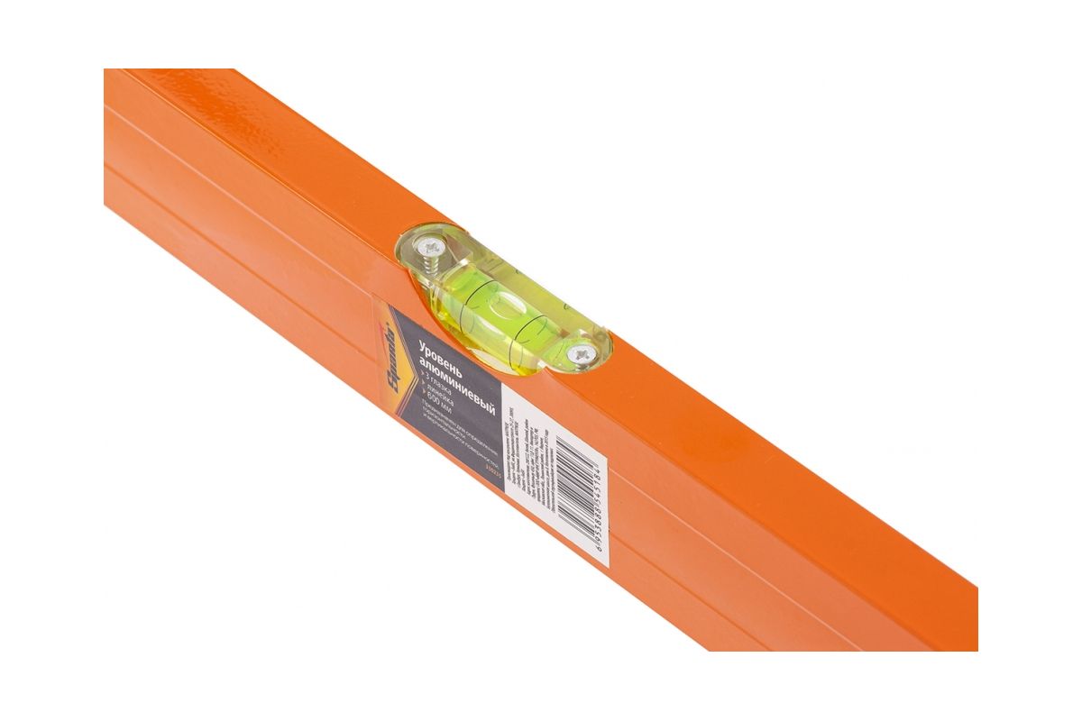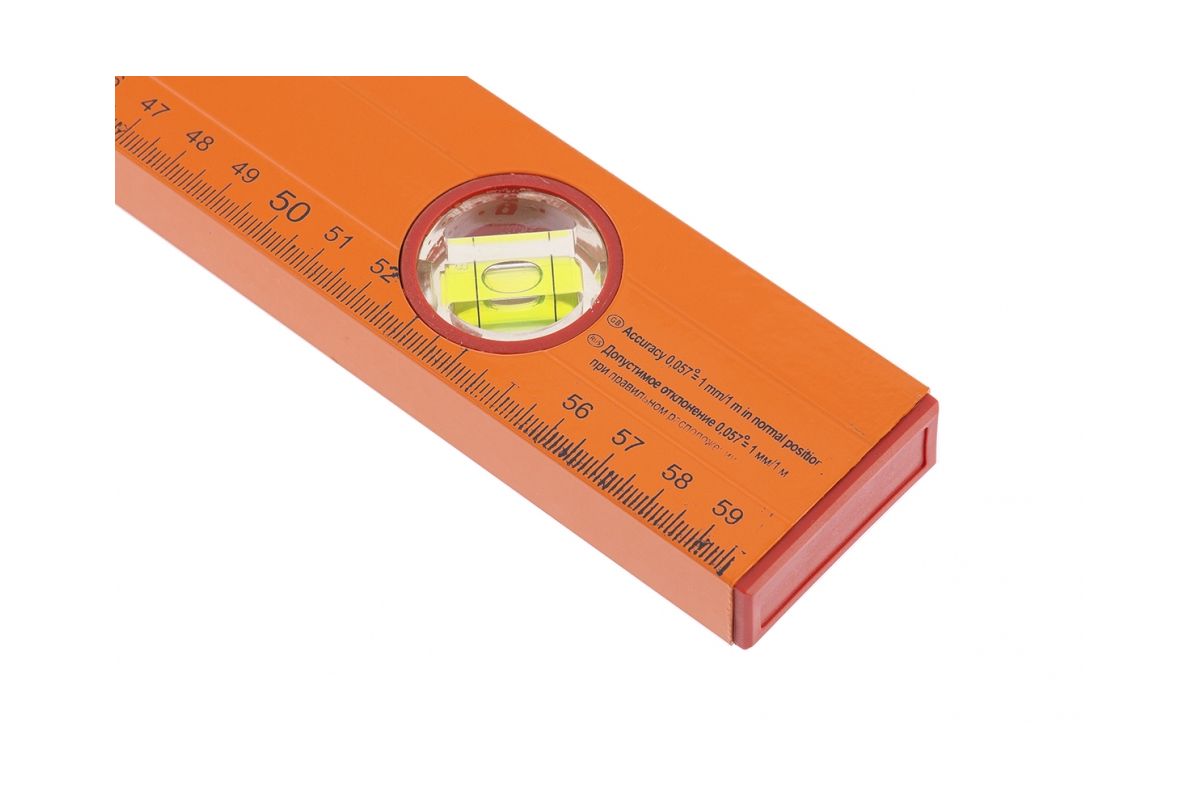 Корпус уровня изготовлен из прямоугольного алюминиевого профиля. Вес погонного метра – 0,17 кг. Пластмассовые заглушки на обоих концах. Модель имеет три акриловых глазка для проверки отклонений по горизонтали, вертикали и под углом 45 градусов. Точность измерений – 1 мм м (0,057 градуса).