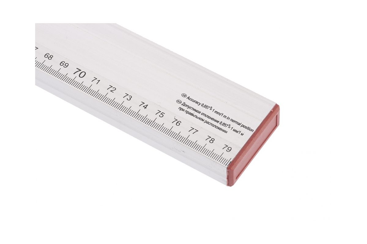 Уровень изготовлен из прямоугольного анодированного алюминиевого профиля. Имеет два пузырьковых глазка для проверки отклонений по горизонтали и вертикали. Точность измерений – 1 мм м (0,057 градуса).